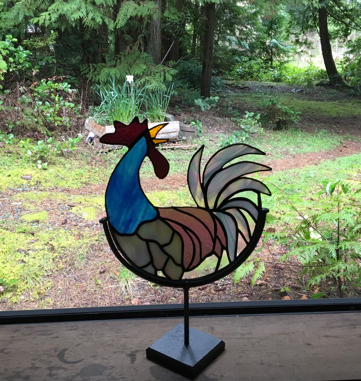 We kept chickens for about forty years. Our original coop has two stained glass windows. We gave up keeping birds several years ago but are still enthralled with all things feathered. I love playing with glass and I love chickens so it’s a good combination. Roosters always have a lot of character and are prone to showing off like these guys.