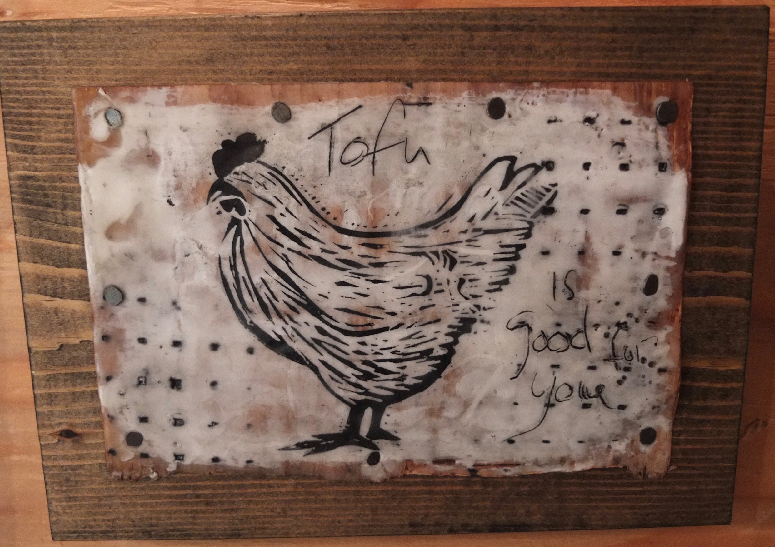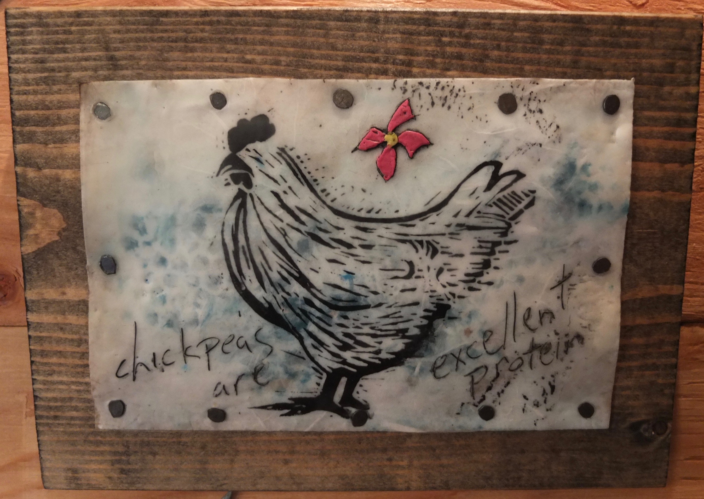Some folks might consider this a free lunch but I am vegan so Layla (as we named her immediately because, why not) had to find a home that was not ours. Fortunately for her, we happen to live next door to a crazy chicken lady and, fortunately for us, Claire was home and willing to take on the care and feeding of this runaway poultry princess. The entire tale (pardon the pun) was not only a source of amusement but the inspiration for a series of light hearted wax prints I called, “Subversive Vegan Propaganda”.