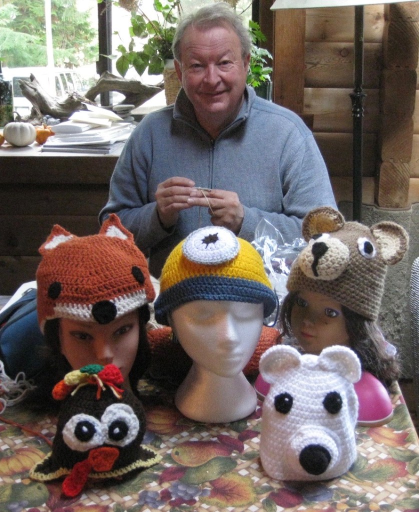 When Jacqueline and Chris were first together they were in a long distance relationship – her in Canada and him in England – he crocheted her a sweater. He now makes funky hats; so far he’s found patterns for all kinds of animals, including a turkey, but, sadly, not a chicken.