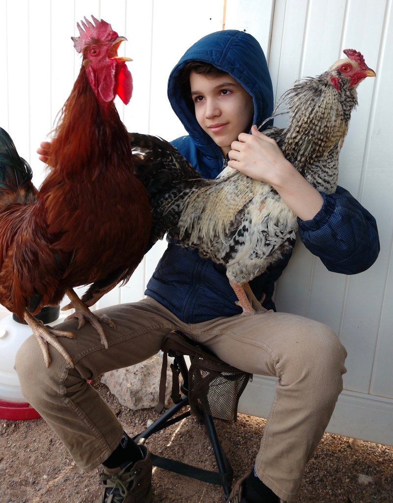 When it comes to older children who might be allowed to stay home alone, it is important to have an emergency plan in place. Our teenage boys are not permitted to go into the housing alone under normal circumstances. However, they have been taught how to pick up the birds safely, to watch for heads and feet when closing the door, what noises would indicate a problem or distress in the flock and where to find basic supplies.