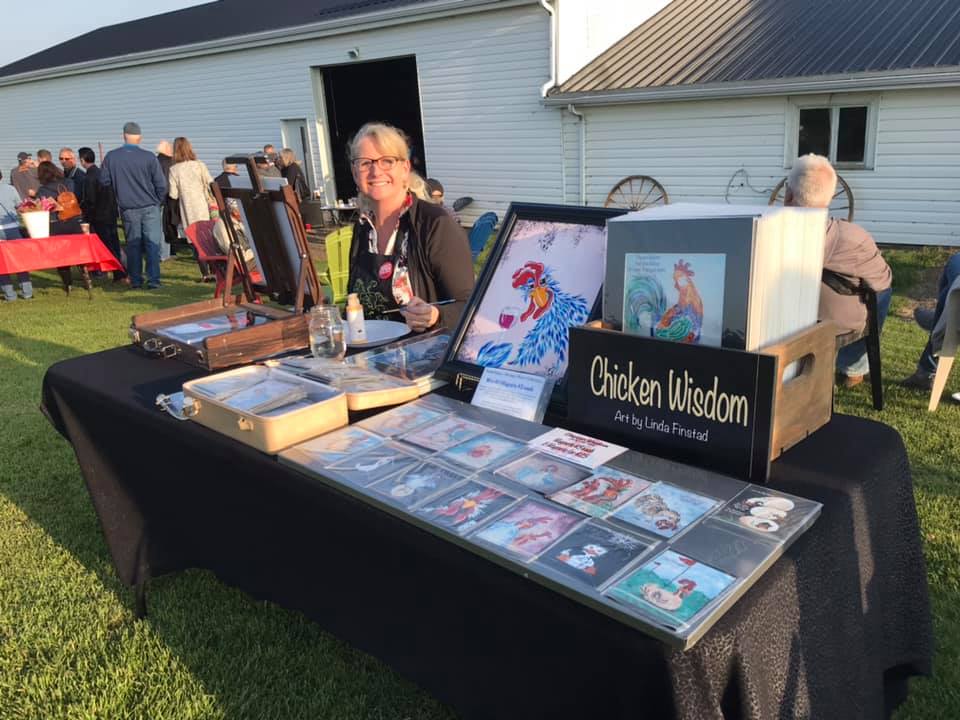 Hmm… that is a hard question as I love all aspects of being an artist and writer. However I really enjoy art shows and fairs especially when people are around my booth laughing at the antics of my chickens and angels. It brings me great joy that my artistic talents to make people giggle.
