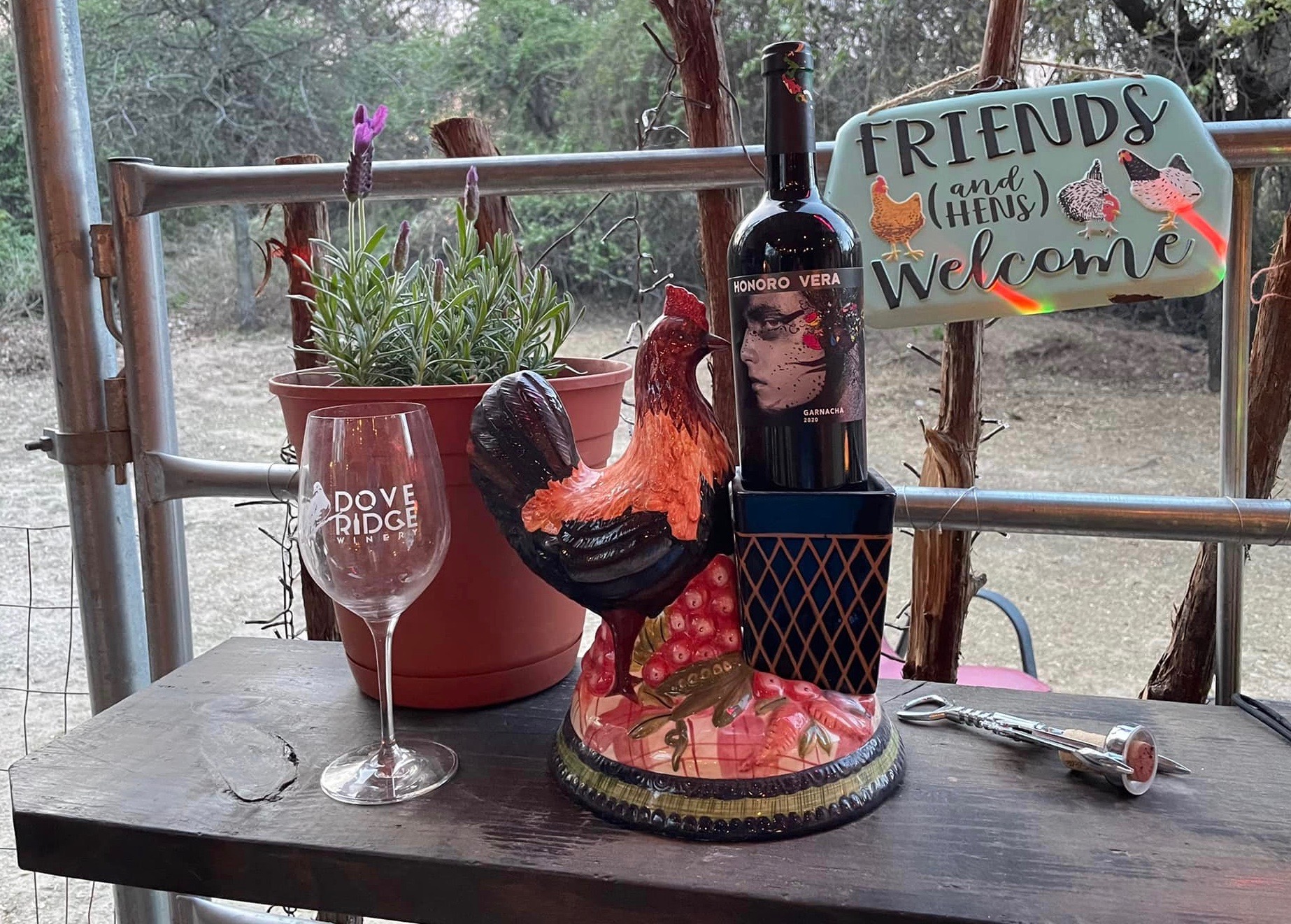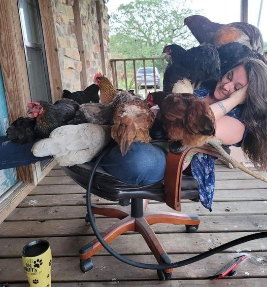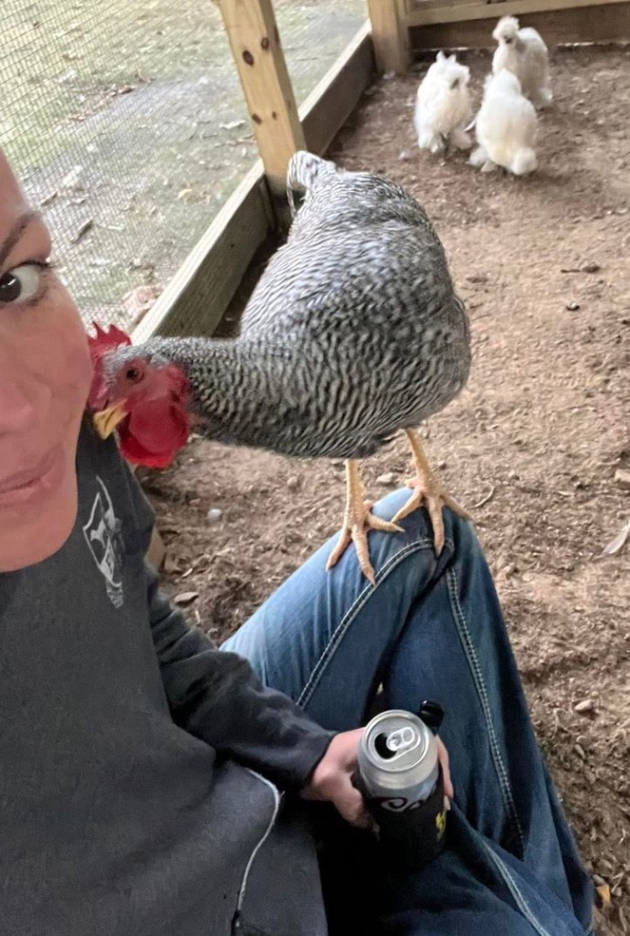 I don’t drink very often with the chickens because they knock glasses over, but we do love to sit together and eat grapes. That’s our special daily time together. – Sandy McMillan