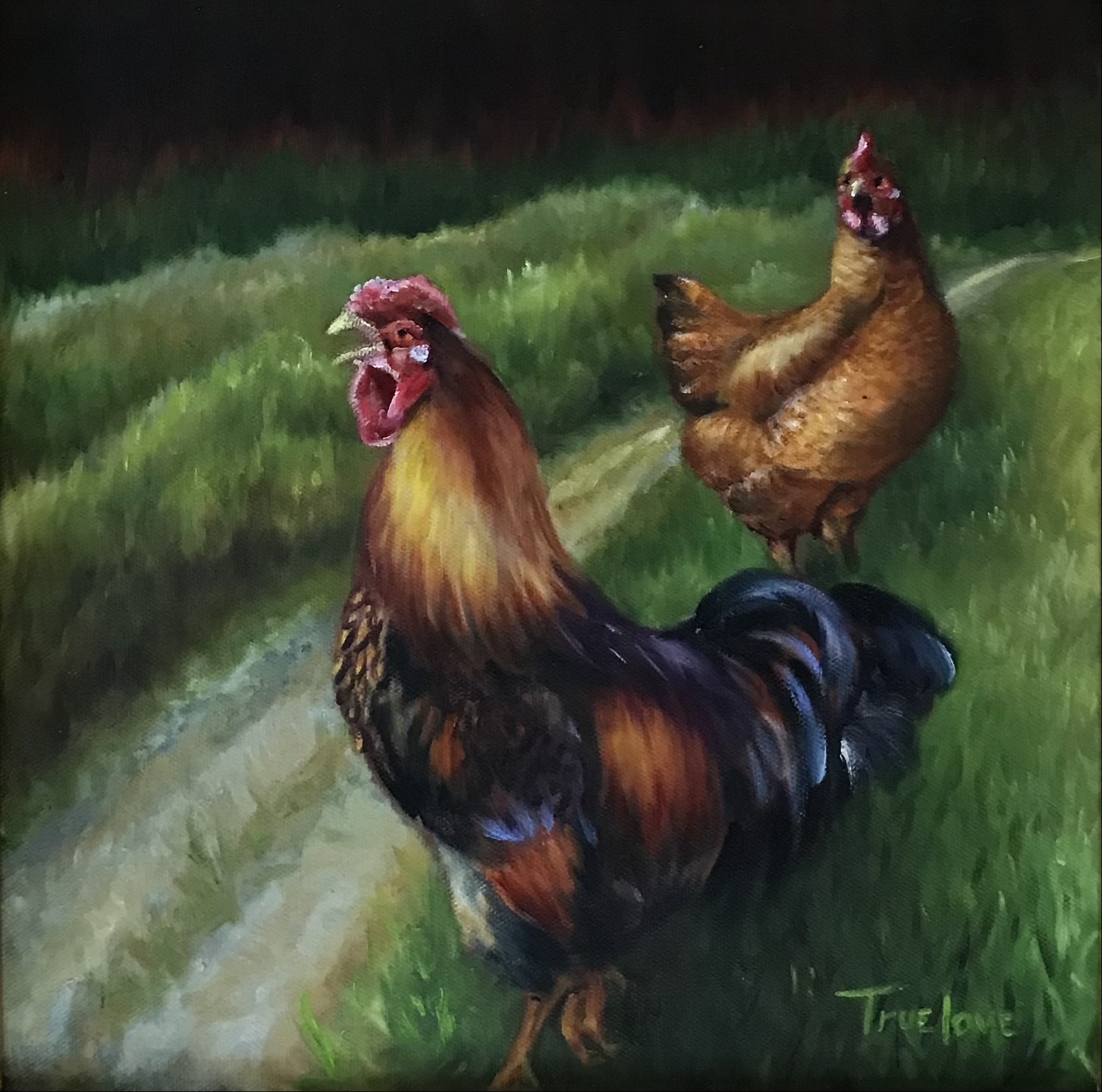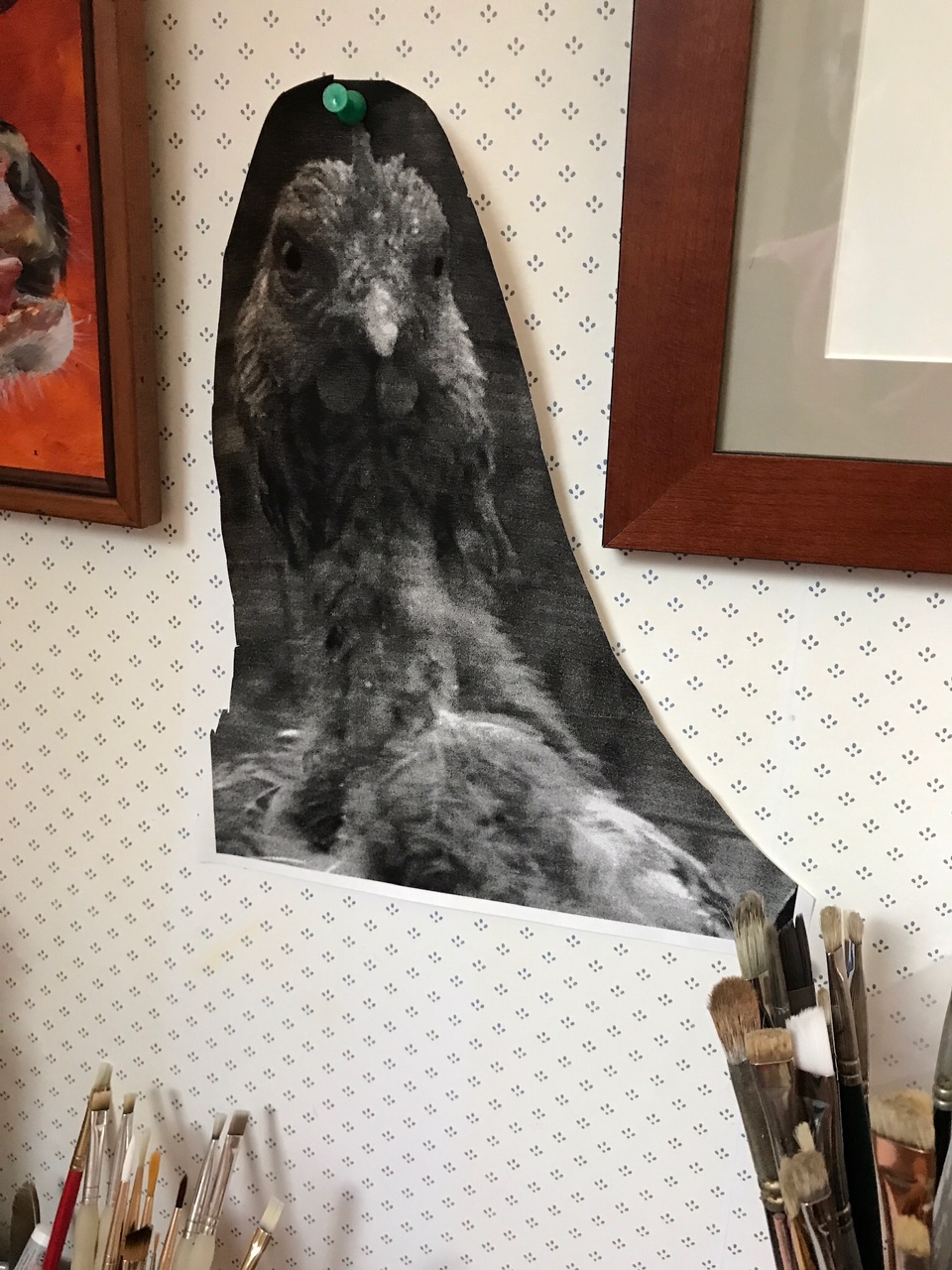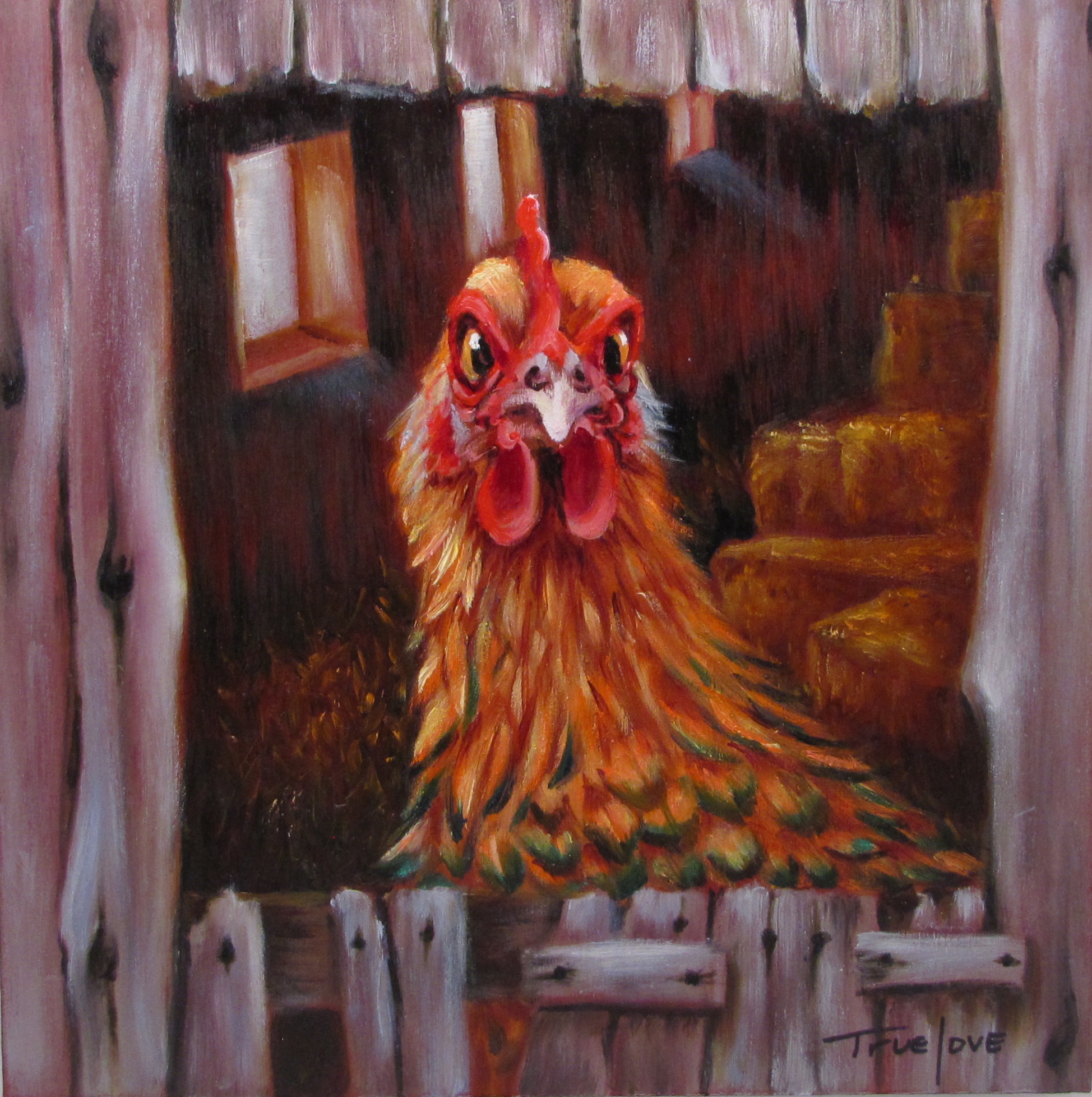 My art muse is the Pissed Off Hen. I have a terrible black and white blown up image of one of my hens from decades ago on the wall by my workbench. Her neck feathers were gone, as sometimes happens. I used to lie on the ground outside their run and snap photos for painting subject material. She moseyed over to the fence, straightened her neck out all the way and stared down at me in the most superior way possible. I have painted that image in so many formats. And I honour her by giving her luscious feathering on her neck in every painting and she morphs into different breeds, different colors and even different degrees of irritability. I must say, quite immodestly, that I have the glare of a hen down pat.