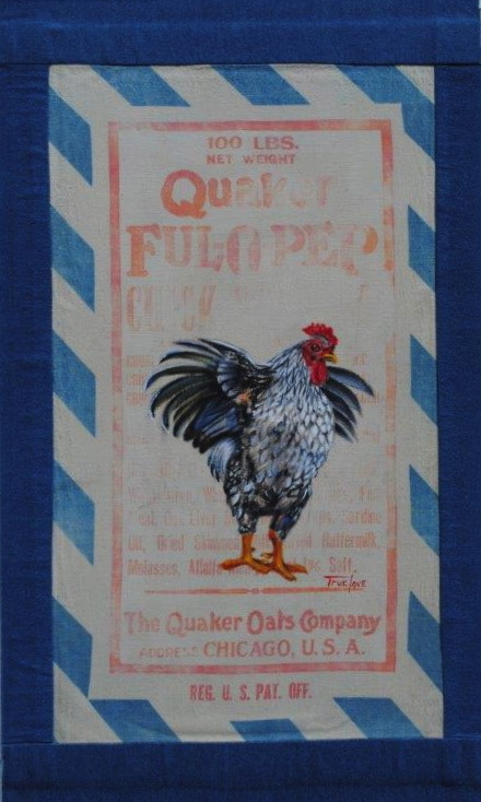 One side gig I’ve done is to root around at flea markets to find vintage grain bags with cool graphics on them. The older ones are linen or at least linen-like fabric and great to paint on, almost like a linen canvas. I stretch and embellish them with my paintings before framing them. I try to preserve the original graphics and paint in the blank areas. I had one win a Judge’s Award at the International Exhibition on Animals in Art at Louisiana Veterinary School. It was on a bag of chicken feed named (I swear, this is the real name) Lay or Bust. There was a nice big square in the middle of the graphics that I used and painted my art muse, the Pissed Off Hen, sitting on a nest.