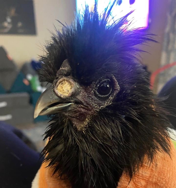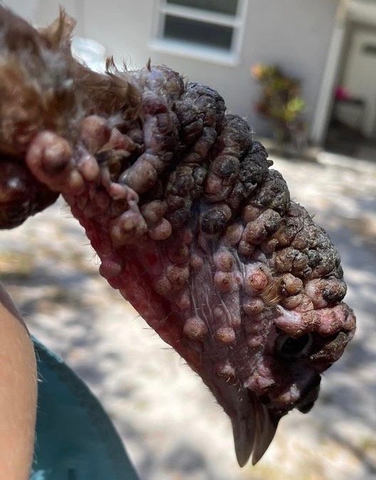 Dr Bowes: This is a classic case of Fowl Pox, which is often self-limiting if the nares (nostrils) aren’t blocked, affecting breathing. The scabs heal from the inside out and then drop off. Those scabs carry the virus and can affect other turkeys and chickens. You can use iodine topically that help them heal faster. The pox virus lives in the environment so it’s difficult to sanitize after having sick birds. This is one of two viruses (the other is ILT) that I would recommend vaccinating even when a bird is already sick as a means of boosting the immune system. Note: That bird was probably sick for 4-6 weeks before you adopted it, meaning the previous owner did nothing to treat it.