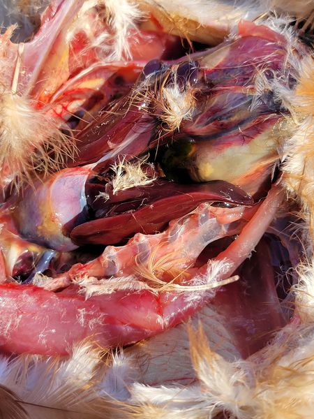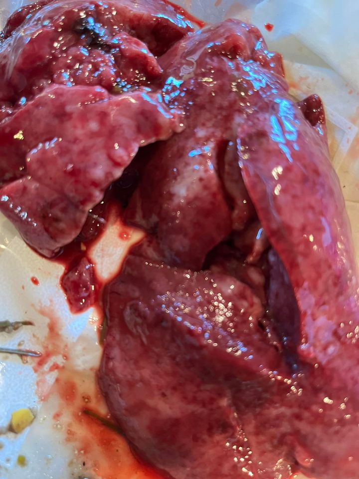 “We had this hen who was doing great then just died. When I opened her up her liver was huge and had marks all over it. The first picture is when I first cut her open. The second picture is the pile of her liver. “ – Rose McCurdy