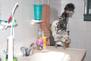 The only time my birds have been in the house is for first aid treatment or short stays in the infirmary. My curiosity is piqued by seeing how other folks have embraced their feathered friends as part of everyday life: photo shoots of first eggs, babies attired in chicken themed onesies, house chickens that go on vacation with their keepers, birthday parties, weddings and sadly, funerals.
