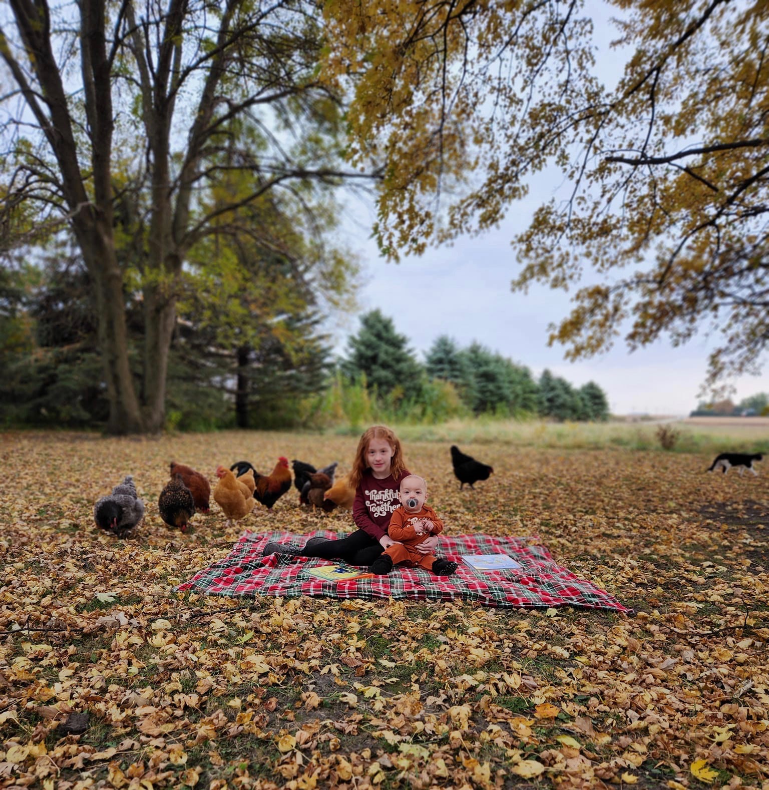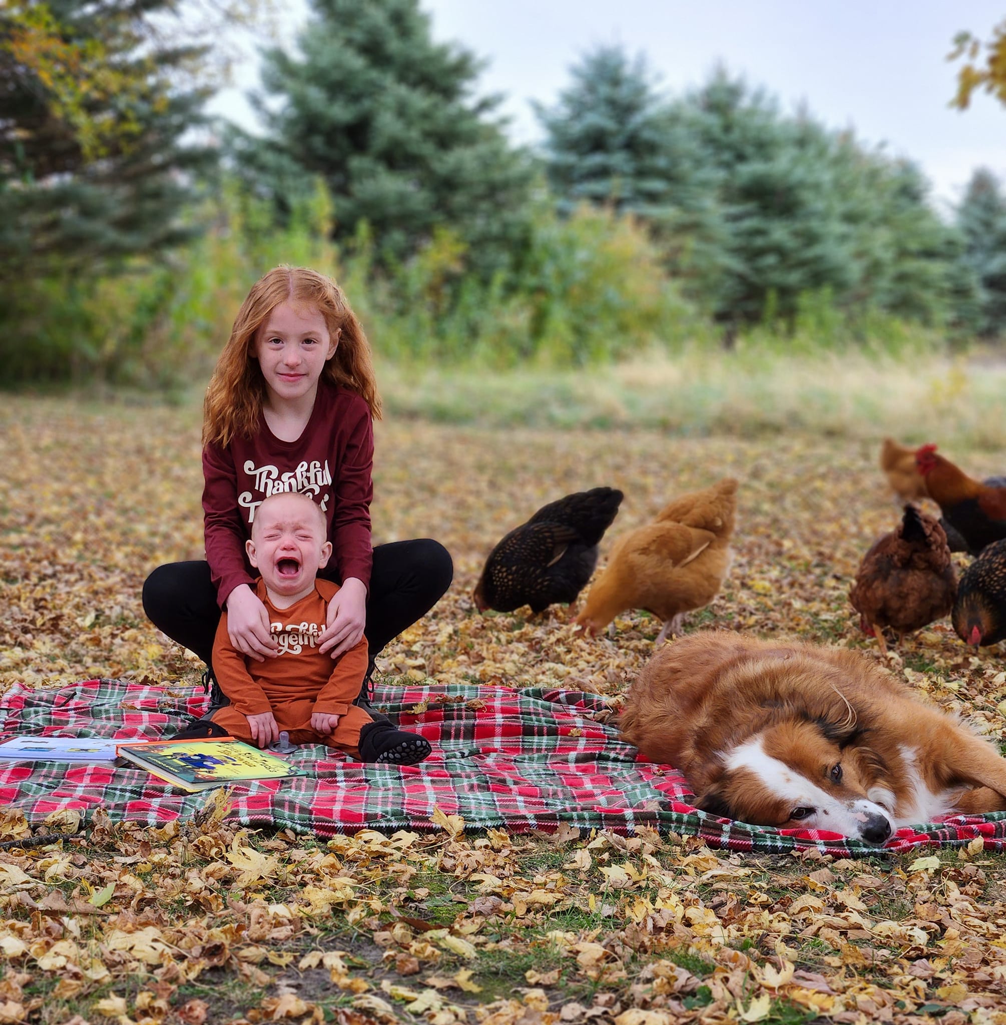 “I got photos of my kids this evening. The chickens thought I’d have snacks. No snacks, but they did decide to partake in the photo shoot – uninvited. These are Christmas cards. My favorite is of course the classic Hallmark with a crying babe. Poor Walter, all his hens are a handful, then you add in my little savages and our pets.” – Annie Savage
