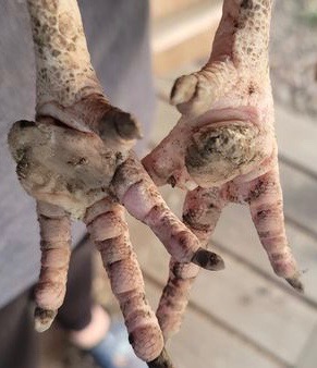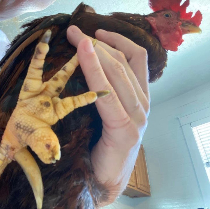 This chicken’s feet are crazy; there is so much loose skin on her foot pads. I’m usually pretty good about monitoring bumblefoot. If anyone is limping they are checked out and the lesion is removed. I’m not sure how this girl got such saggy skin on the soles of her feet. It looks like the inside ballooned and deflated. One side does have what looks to be an old bumblefoot that is not actively inflamed. I can’t believe she’s never limped. Since she is running around normally and not in pain I will just keep an eye on it. – Kateri KP