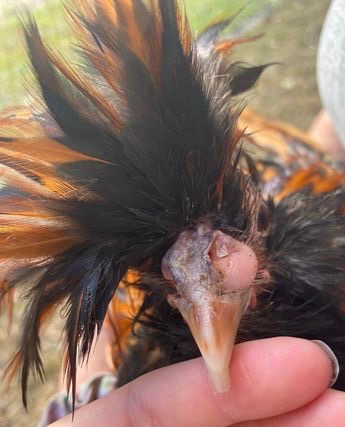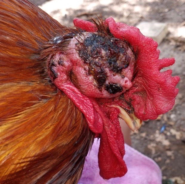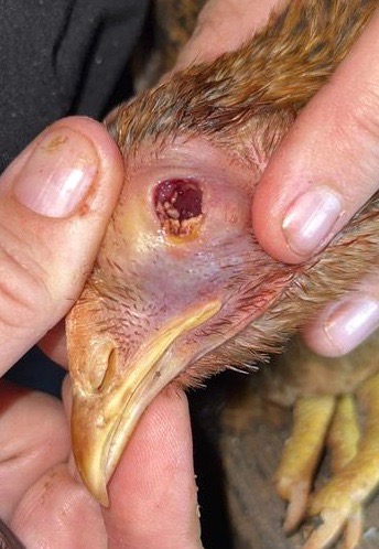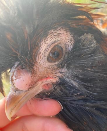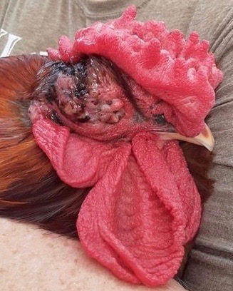 These images show how fast this mass has grown over a period of two weeks. It started way past the eye and has slowly consumed it. I’ve given him penicillin injections (sixth & last injection yesterday), rinsed with saline, applied ointment, fed turmeric, oregano and red pepper flakes, and occasionally put apple cider vinegar in his drinking water. He is otherwise acting normal so I’m not culling him. The blood is from me poking gently with needle to try to figure out more about it. – Crystal Gilliam