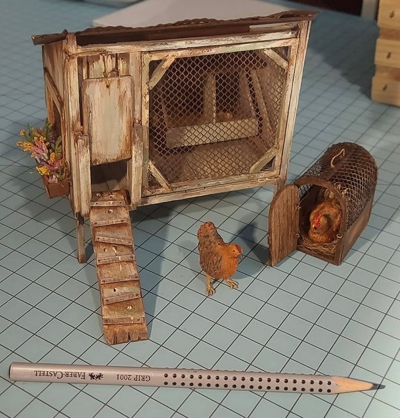 I have a need to try to make my own rather than buy it, so I began making little things for my house and, of course, it had to have chickens and a coop so I went about making one from popsicle sticks. I aged it and even added poop on the ramp. I love to add the smallest details into my work. I made a chicken to go with the coop but you know once you have one you have to have more so I’m in the process of making a few chickens to go in the coop.