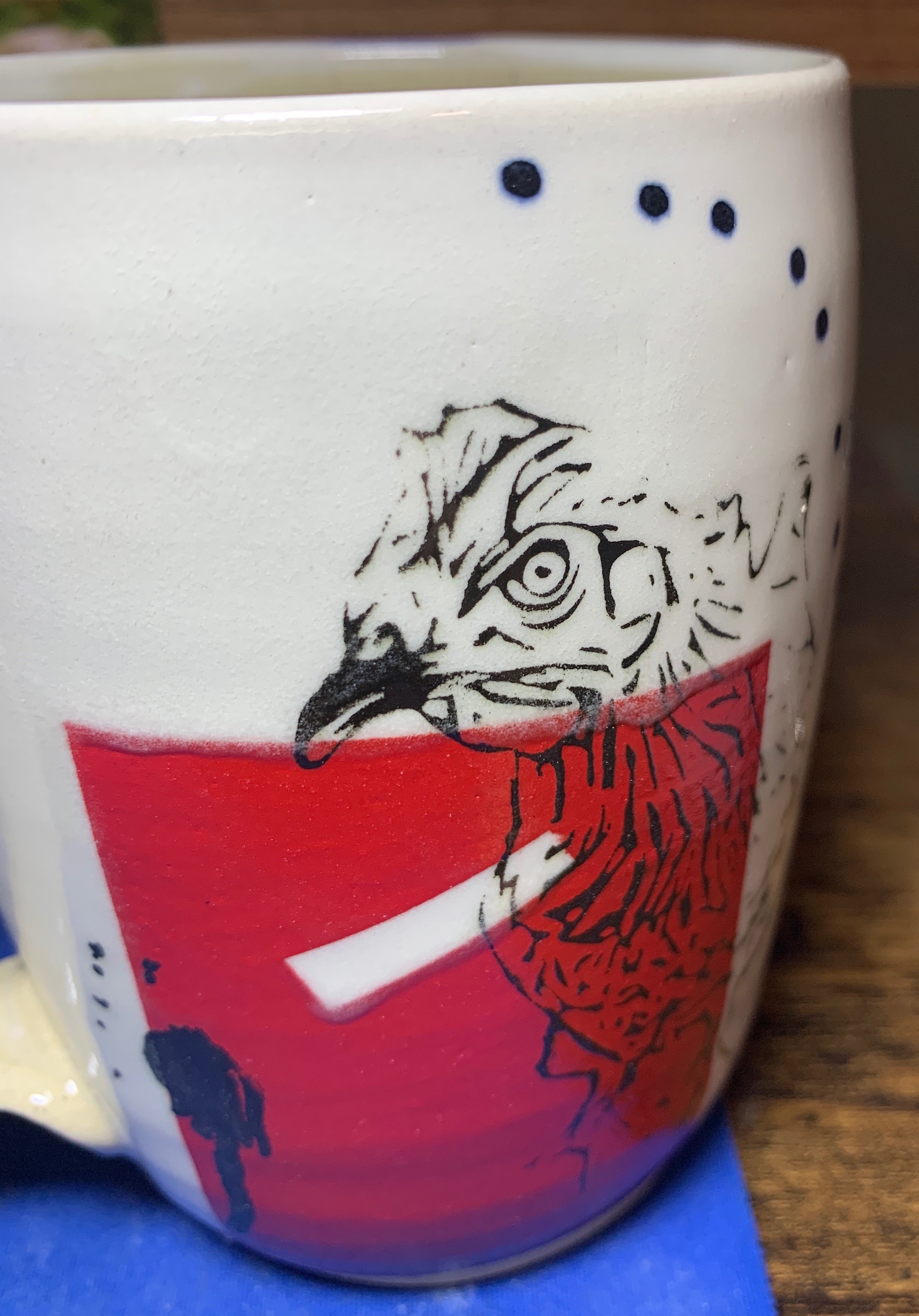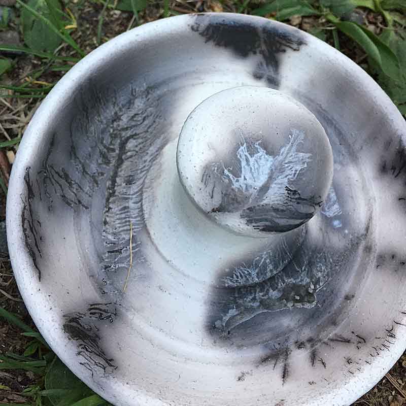 Chickens find a way into my art is a few ways: the graphics, and using their feathers as well as egg cartons. I got obsessed by soap making at one point (loved it) and hated how homemade soap would get slimy in a traditional dish, so this is my version of a well functioning soap dish.  A rare earth magnet gets glued onto the top of this piece then a bottle cap gets pushed into a bar of soap which makes the soap magnetic. It stays suspended in the air never to become slimy again. This version is raku – in which I burned my chicken’s feathers on the exterior to create a pattern.