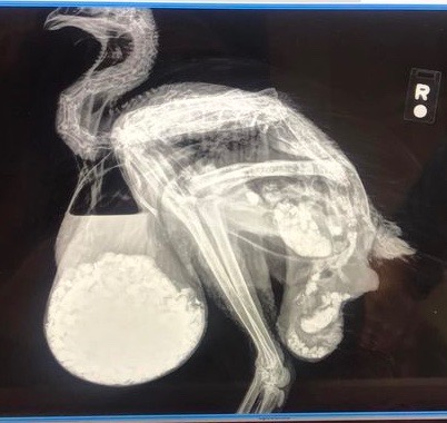 Dr Bowes: This is a case of pendulous crop caused by the ingestion of a large amount of what looks like non-food material (e.g. gravel). I’m curious as to what is causing the bulge past the hock and the cluster at the base. Is that a hernia? There is no cure for this condition. I would recommend humane euthanasia.