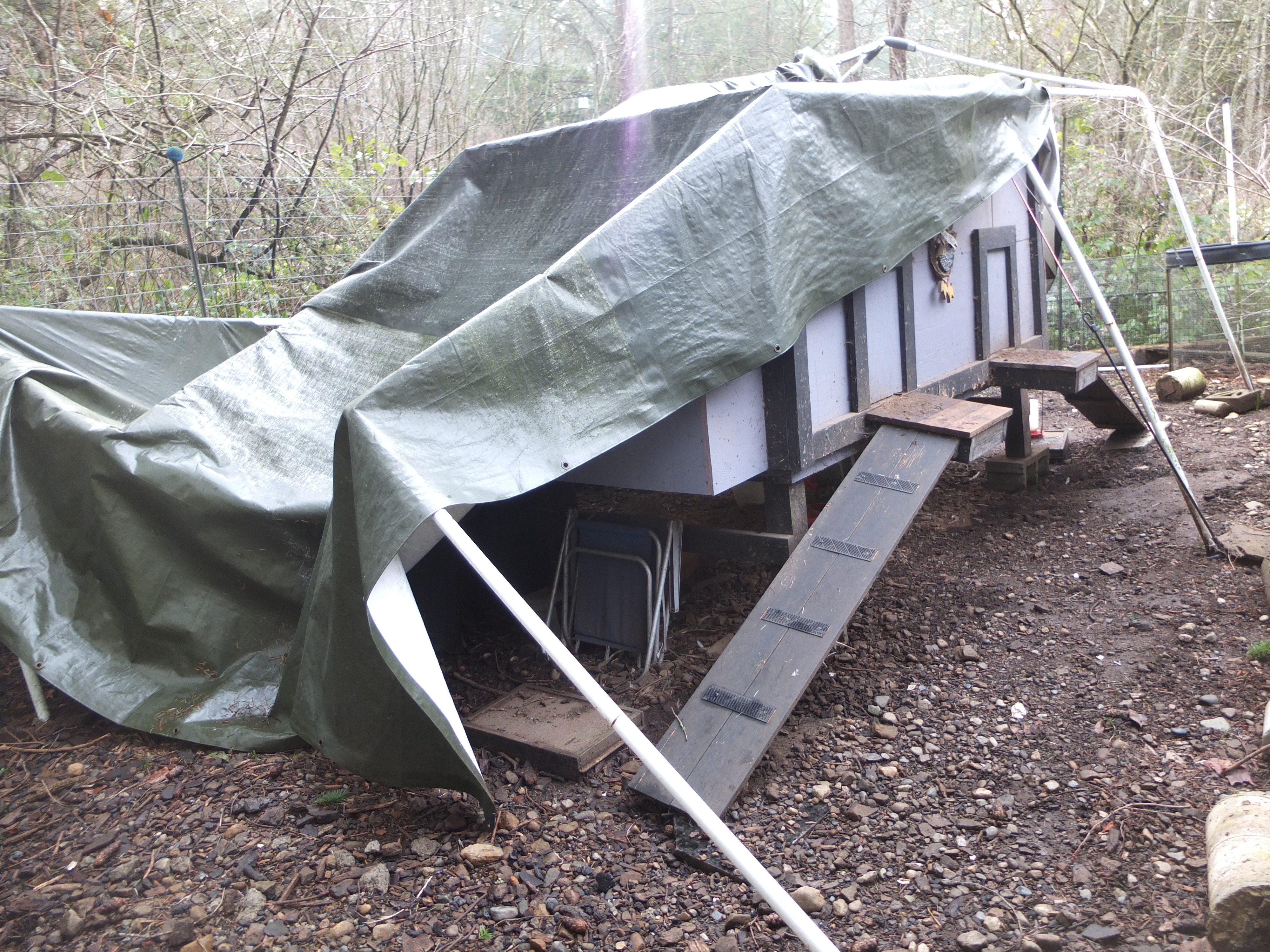 It’s not common but you do hear stories of folks killed by fallen trees while they lay snuggled in their beds. So when the winds start to whip up and howl and the rain is pelting on the metal roof it makes me anxious. The power flickered a few times and although it stayed on I was too distracted to get much work done. By morning, there was a power outage just down the road, which luckily didn’t affect us. I’ve seen photos of chicken coops damaged by storms and was relieved to see my flock had survived unscathed. The worst damage they’ve sustained from heavy snow loads was one year the tarp over their coop was shredded and last year the shelterlogic frame holding the tarp bent and needed replacing.