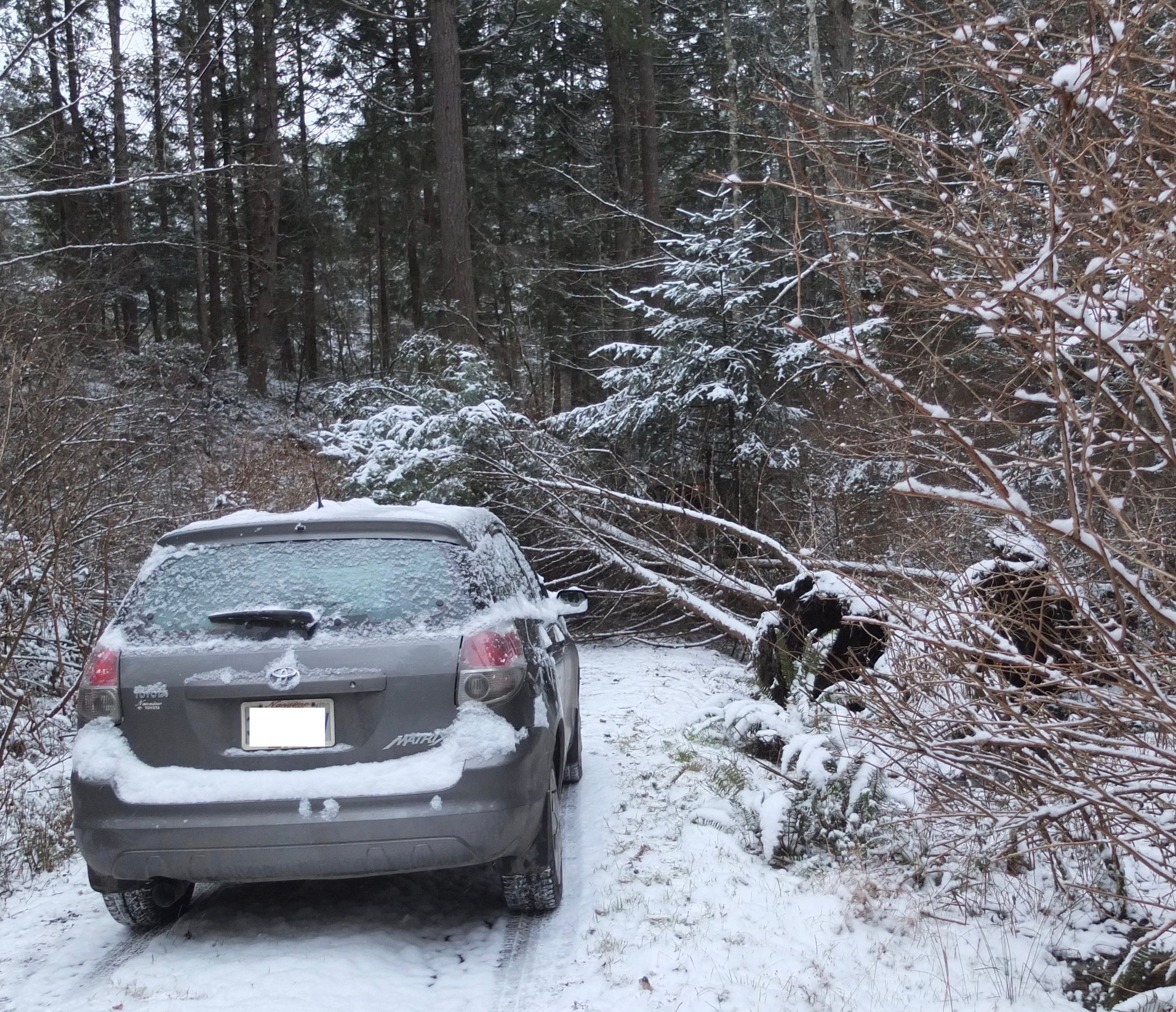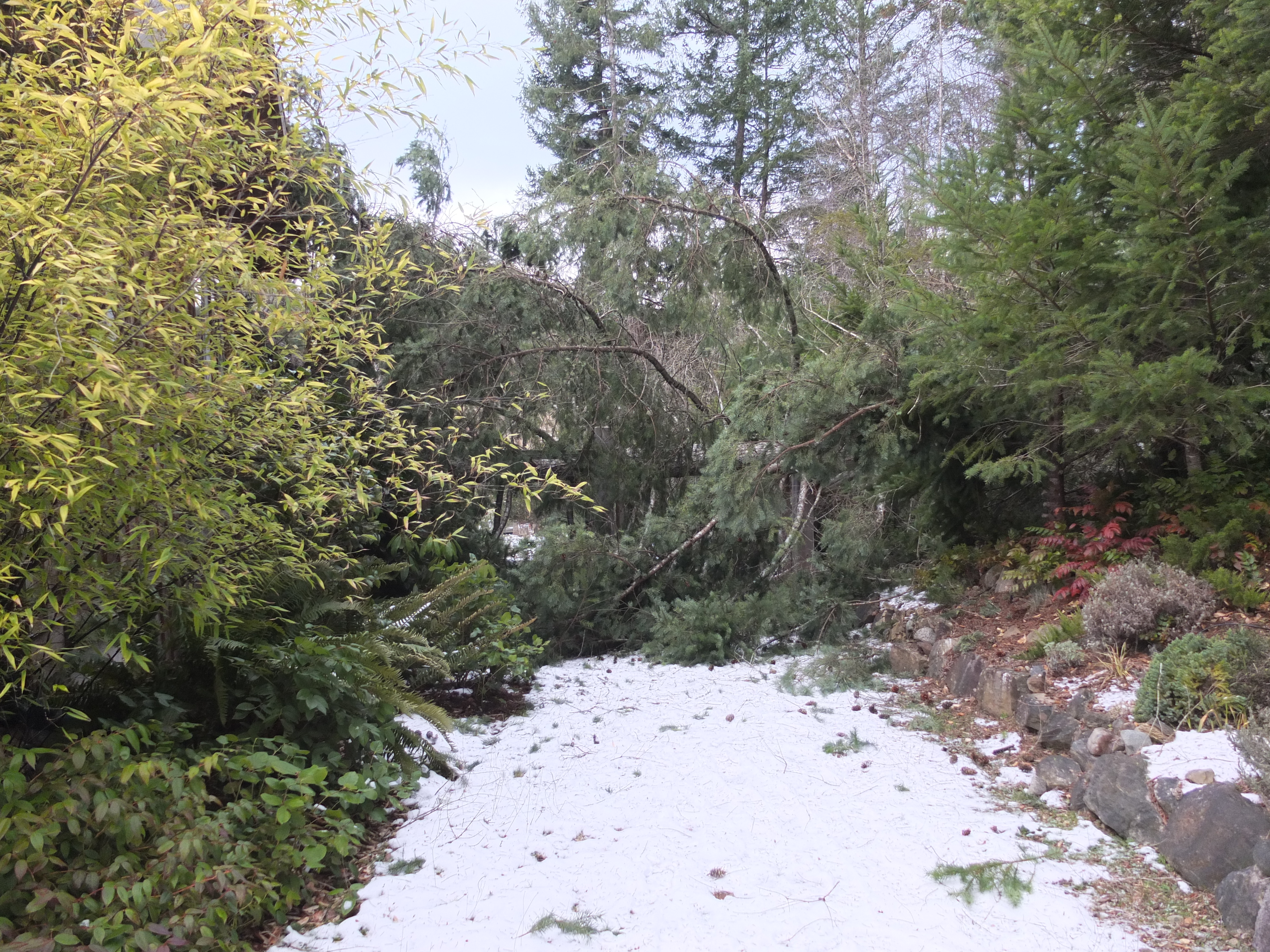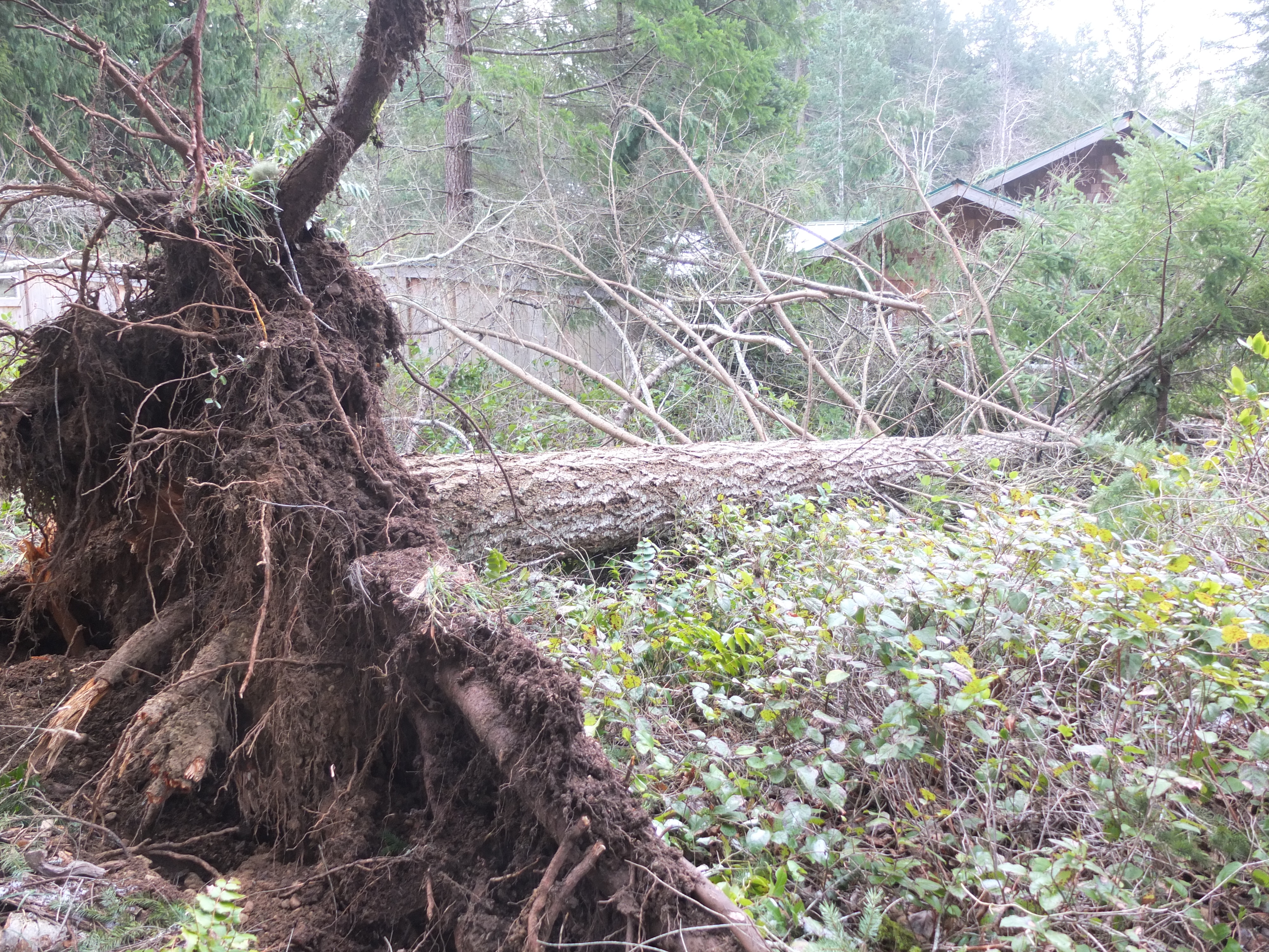 The very next day there was a weather advisory of high winds and lots of rain. If you live in a city you probably don’t think much about those things but nestled into a forest can mean a number of things, namely, power outages and damage from falling trees. Over the 18 years we’ve lived on this property we’ve worked diligently with an eco-forester to remove dead and danger trees, but we’re still surrounded by 75’ Douglas Firs that could do considerable damage if they came down. They’ve fallen beside our guest cabin, on fences and an arbour, over the driveway and four years ago, one fell over the property line onto our neighbours’ house leaving a gaping hole in their roof.