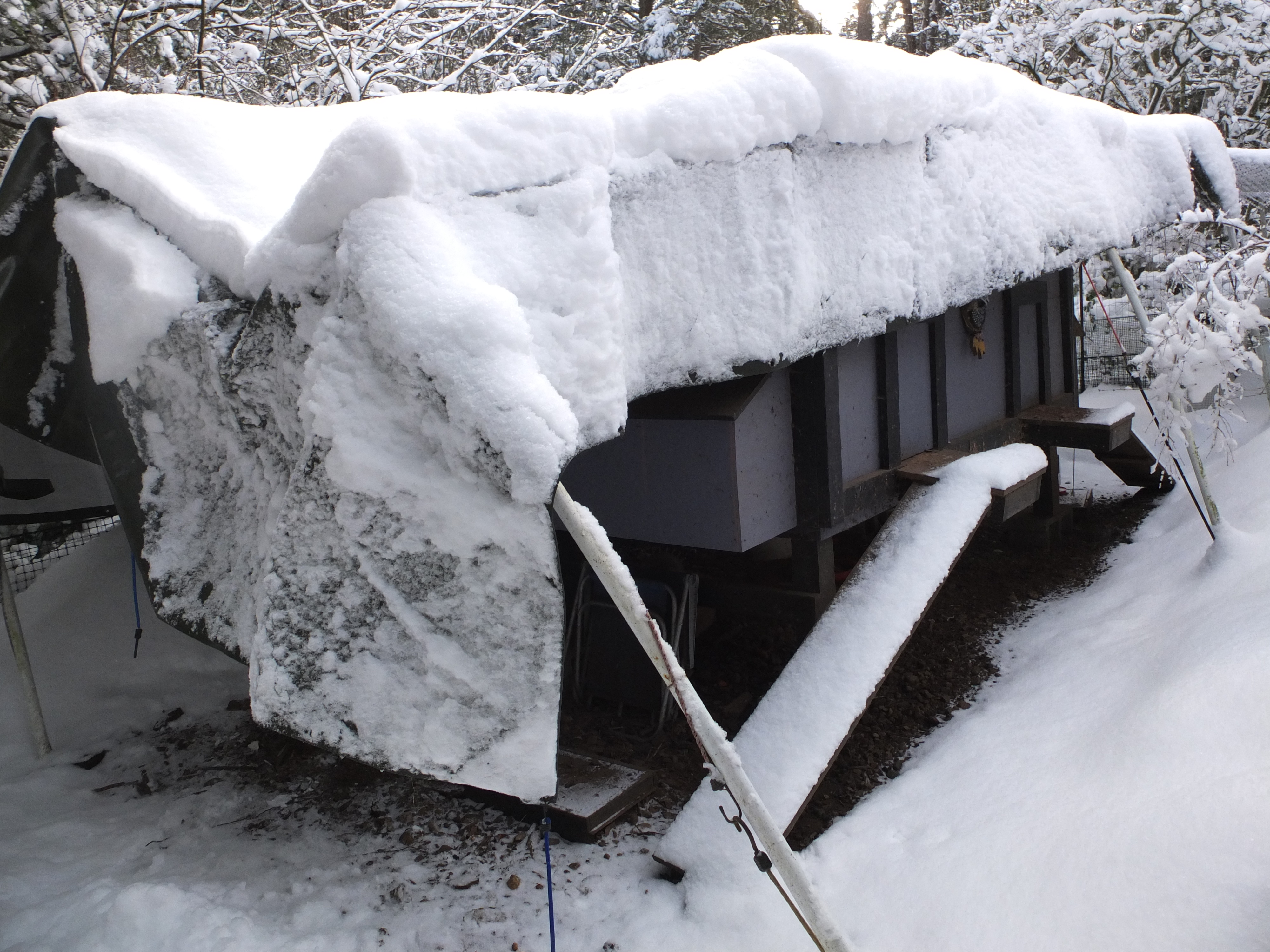 I made it home an hour before lock up only to find that we’d just lost power. So much for my hot bath and an evening of TV watching. I had enough time to do a cursory clean with a poop scoop, fill up the feeders and waterers and knock the snow off the tarps and overhead netting. I started with the main pen. Hitting the tarp to get the snow to slide off didn’t impress my birds. By the time I made it to the back coop my little flock were all huddled into the corner – the only place not protected from the wet snow that was still falling.