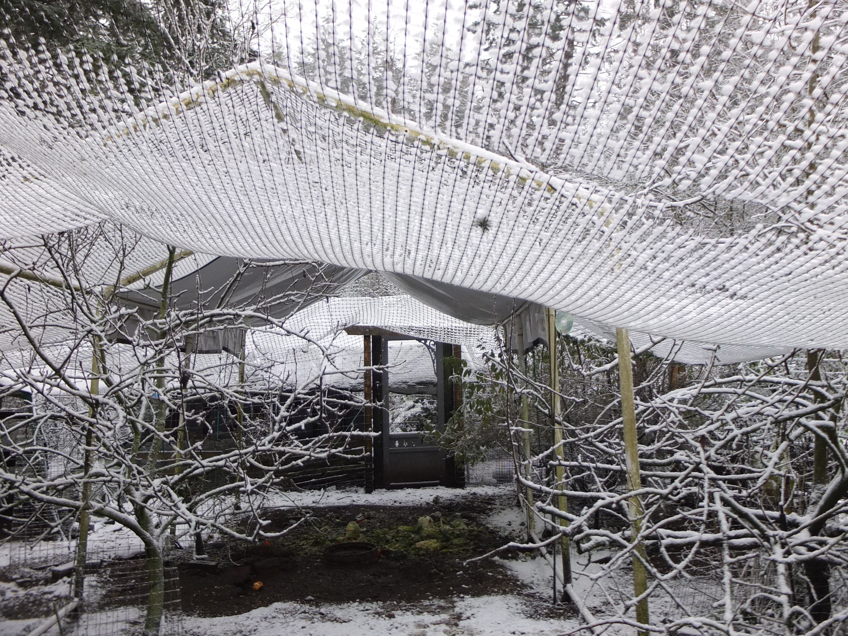 I took the following day off work knowing that my presence would be required to deal with the aftermath of the short-lived snowfall. Sure enough, the netting had separated, and some sections were hanging or were on the ground. I managed to bring the ladder into the pen without spooking my birds and secured everything. By the time I was done my fingers were numb, but my flock was safe.