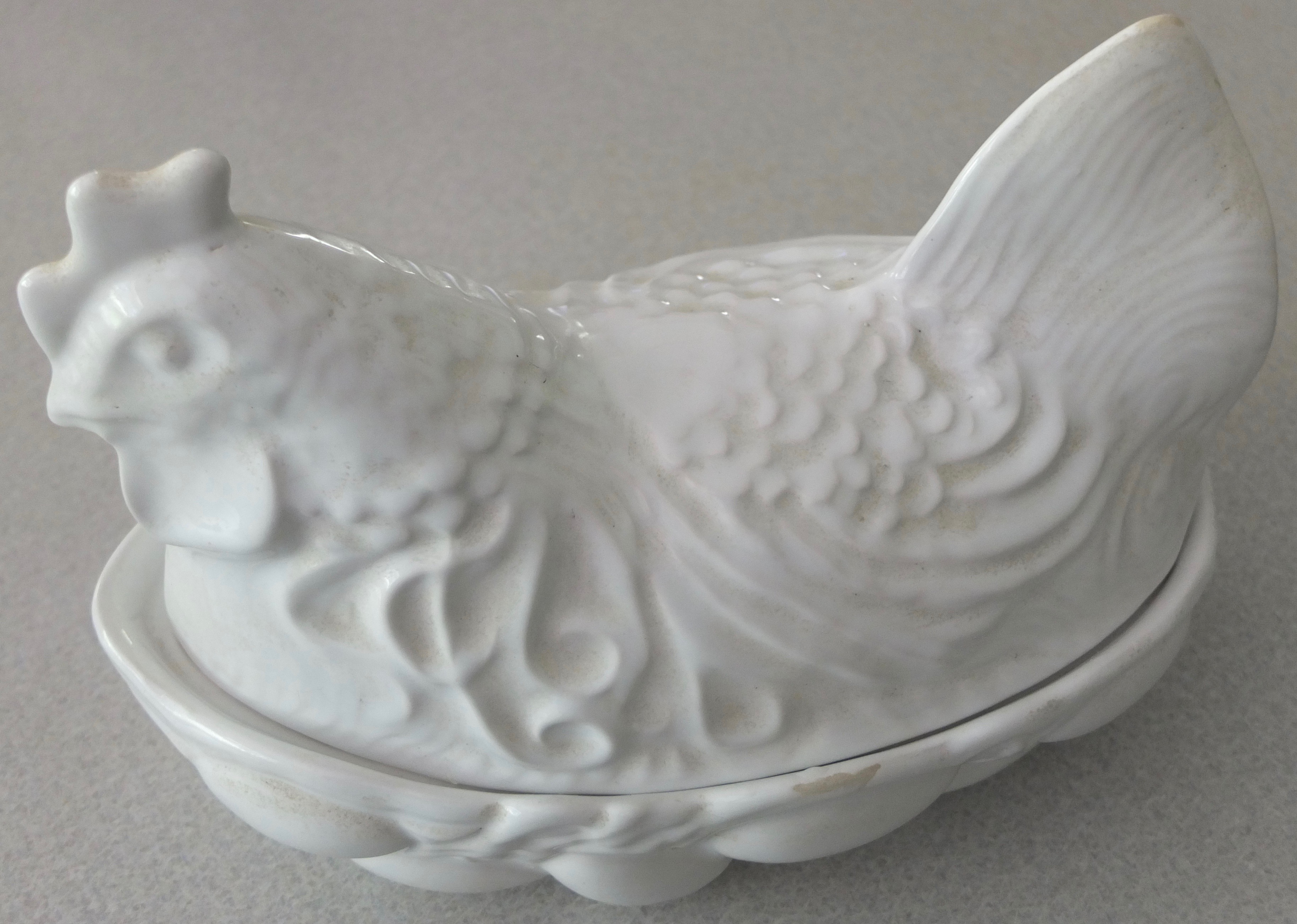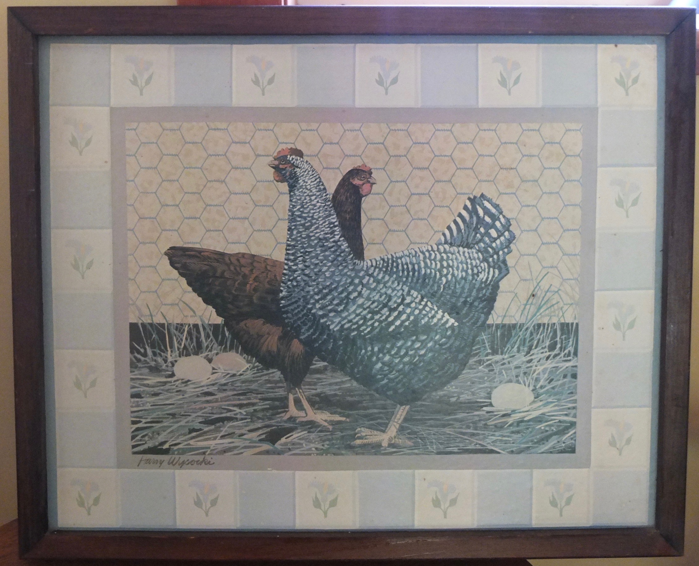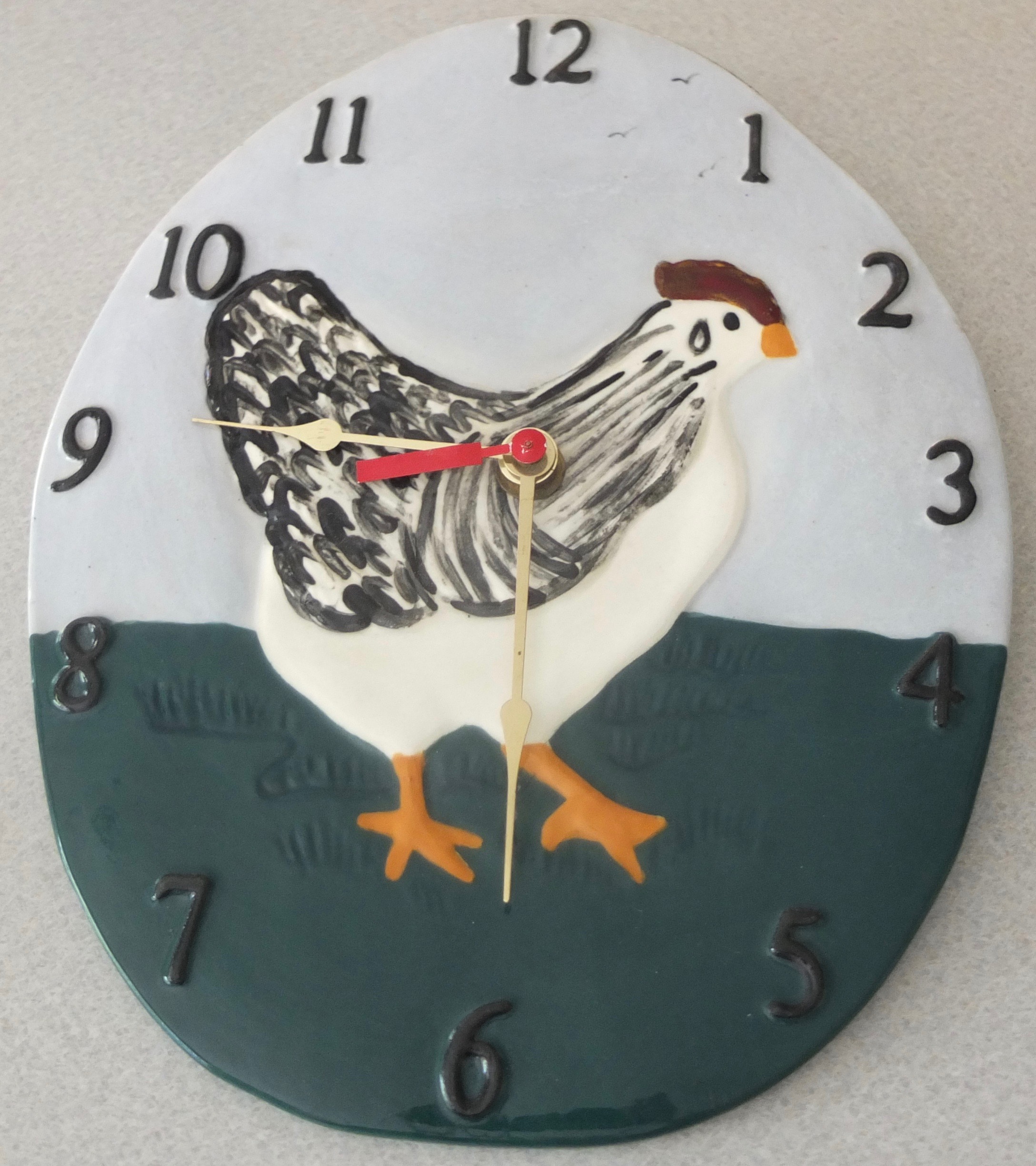 - 2 chicken art; covered ceramic chicken bowl; ceramic chicken clock