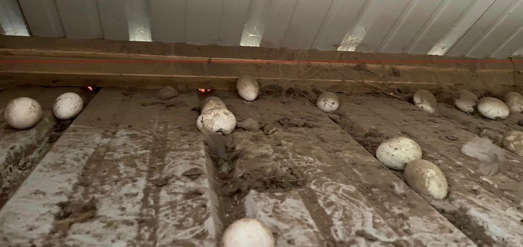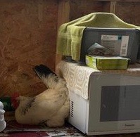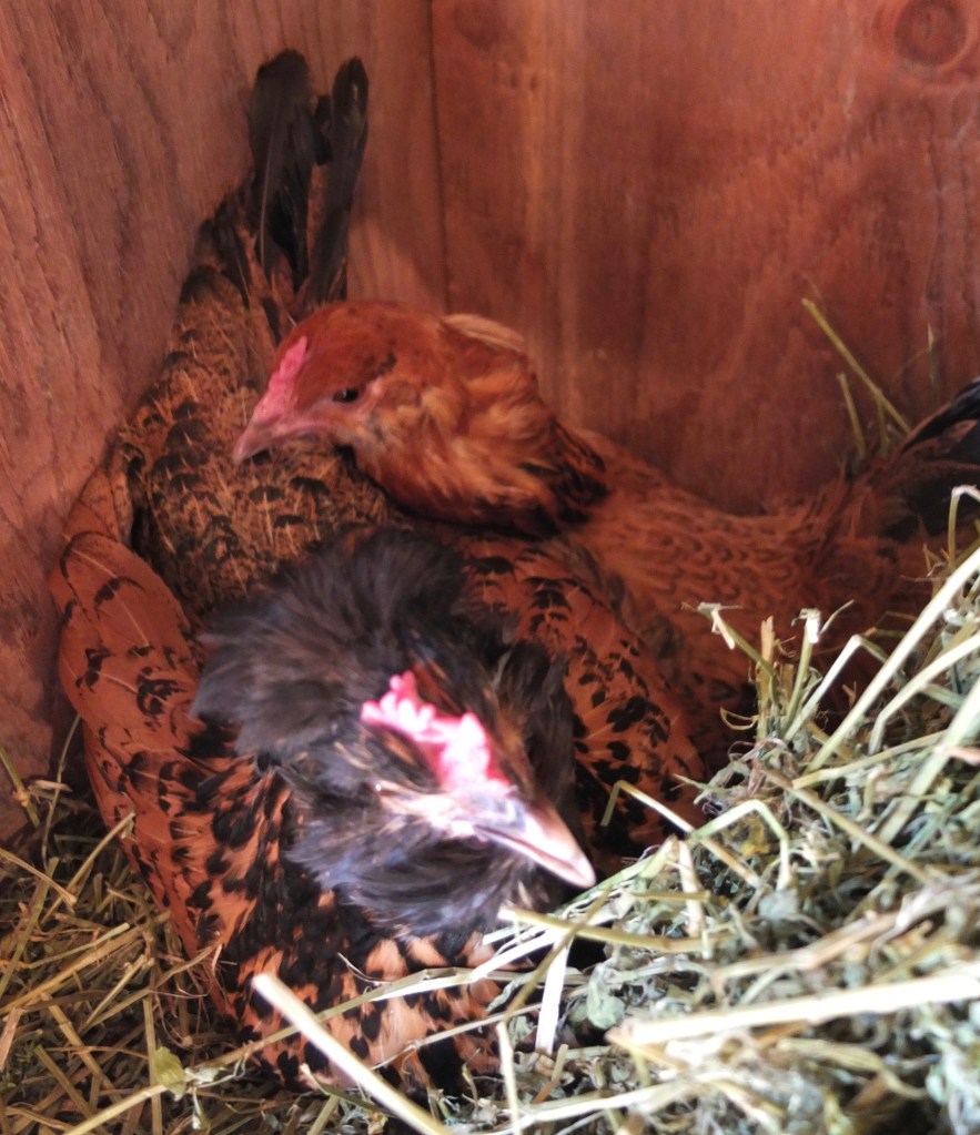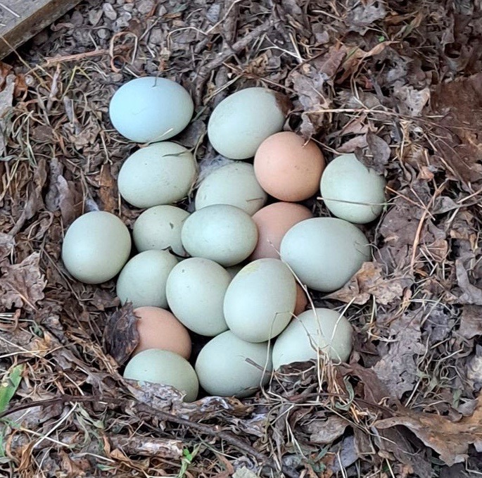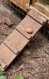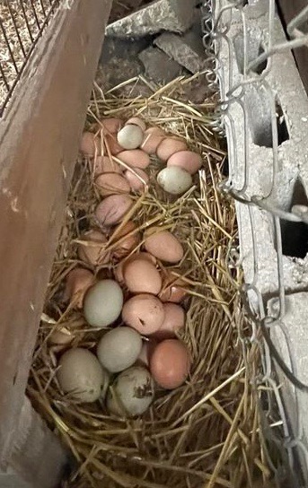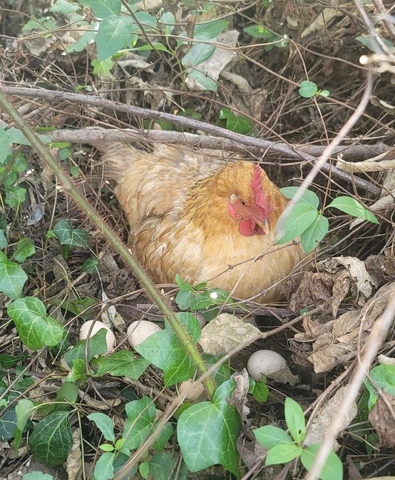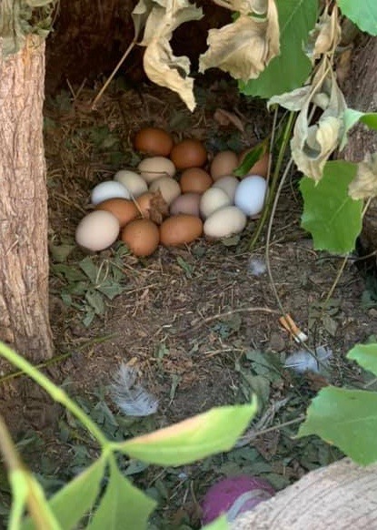 I found communal stashes of eggs in the grass or the woods; and in places like on the welcome mat at my front door, in the tool belt of a tradesman working on my house, or in the outhouse. I learned not to collect all the hidden eggs because that alerted them to move on to a new spot. Even when I left one or two, it still twigged them to my strategy. Luckily I didn’t have any broody hens in that first flock or I probably would have lost even more eggs, or had hens hatching chicks in the forest. I have no idea how many eggs I didn’t get, but I’m sure it was significant.