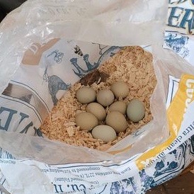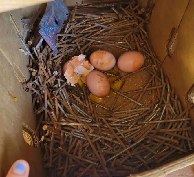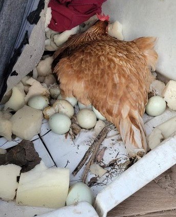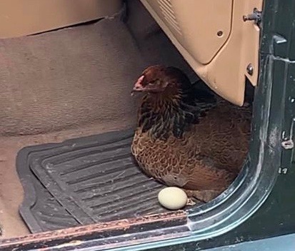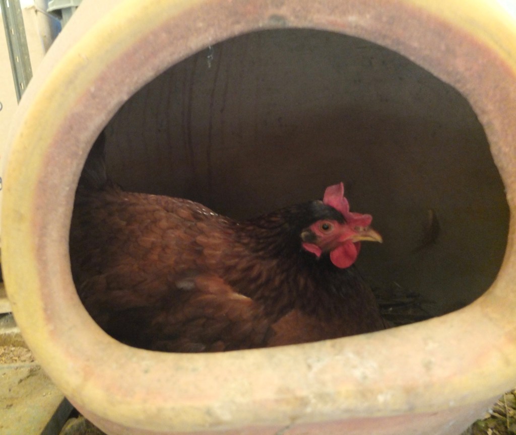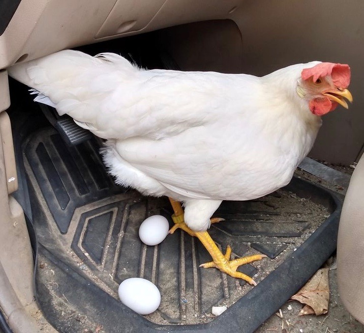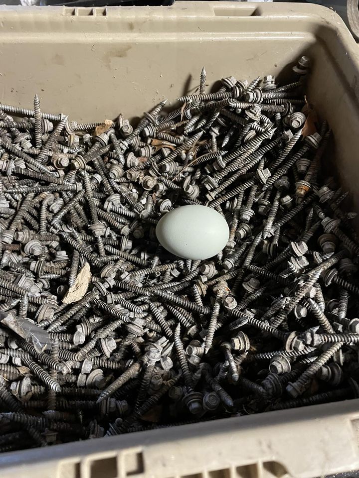 One of the side benefits of having penned birds is that I always find their eggs. Most of them are in the nest boxes, but I occasionally find one on the ground outside the coop. I don’t have photos of all the interesting places I’ve found eggs, but I managed to collect some from other chicken keepers and present them here for your entertainment.