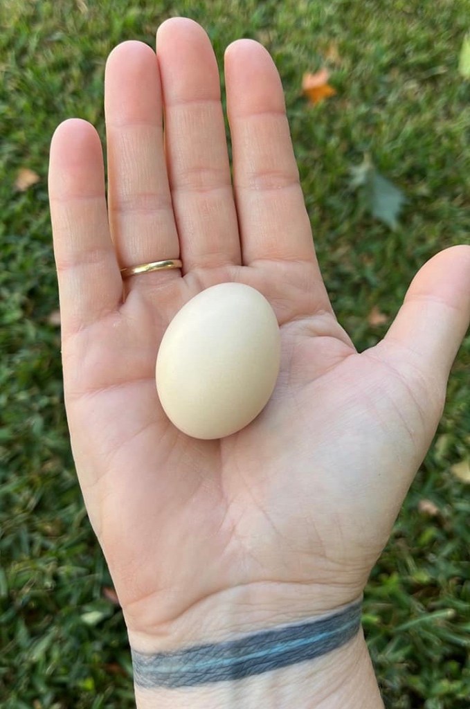 You think you’d get over it after a while but the first egg still makes me eggcited. My Silkie hen, Beeker, popped out her first egg. Three more and I’ll have a snack.