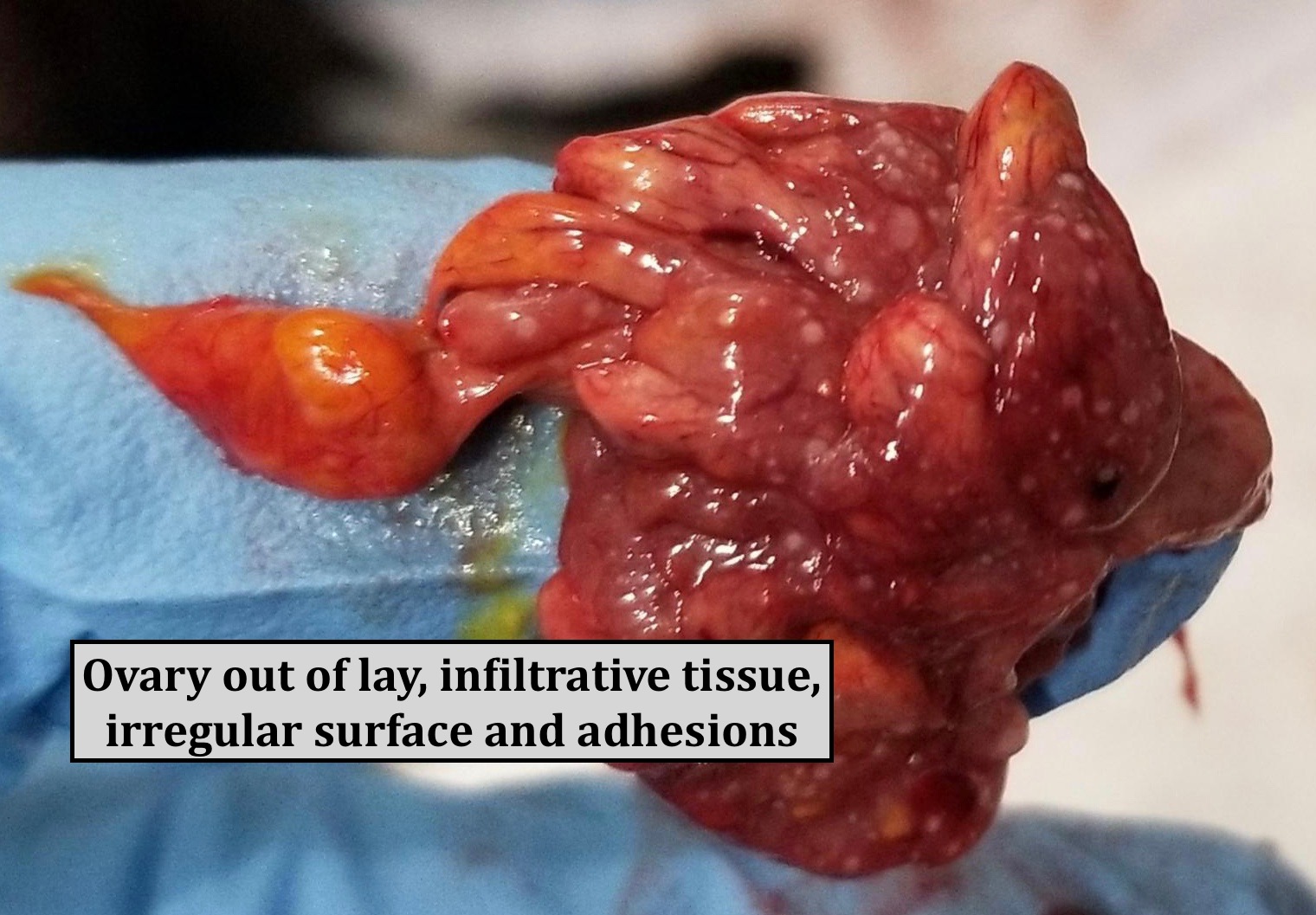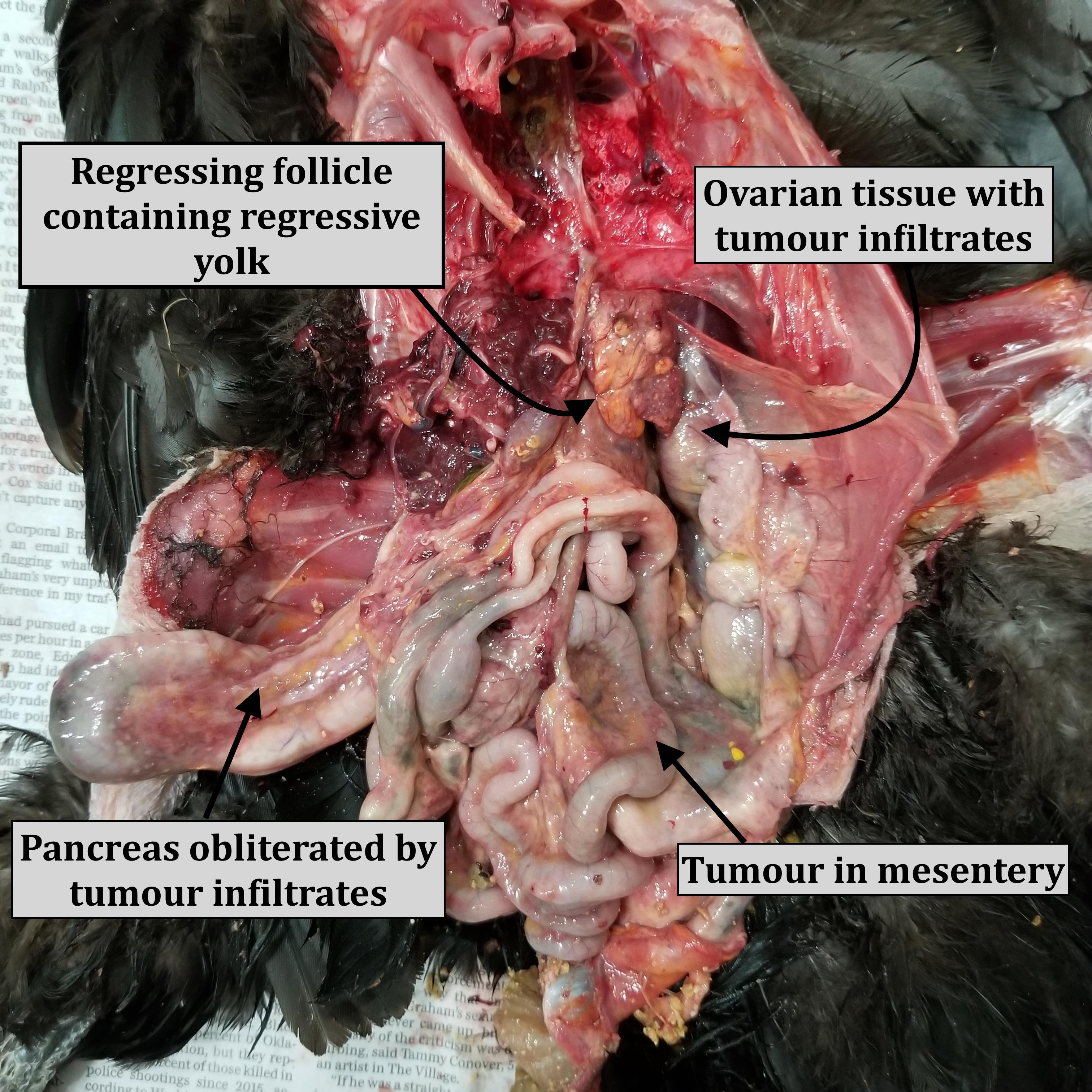 Dr Bowes: She was emaciated with no body fat; the ovary shows she’s out of lay; there were tumours in her pancreas and ovarian tissue and potential tumours in her kidney. Her oviduct was in the correct position, not flaccid, but looks thickened which could indicate a tumour. It would have been helpful to have a photo of the cross-section of the ovary (i.e. cut open and photographed).