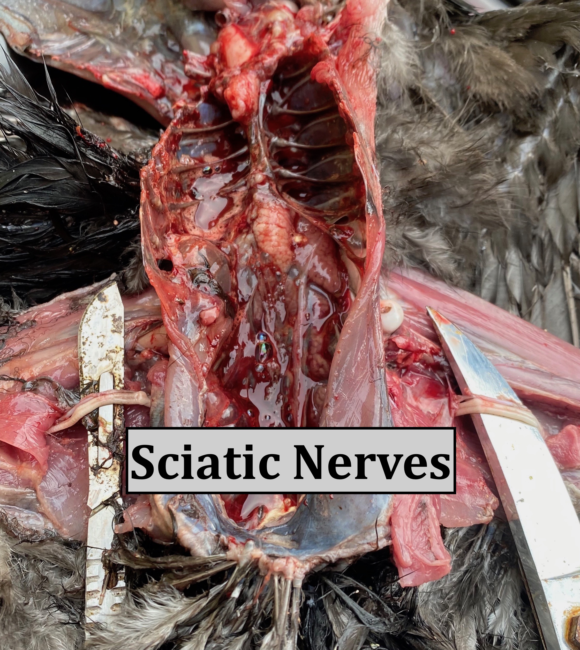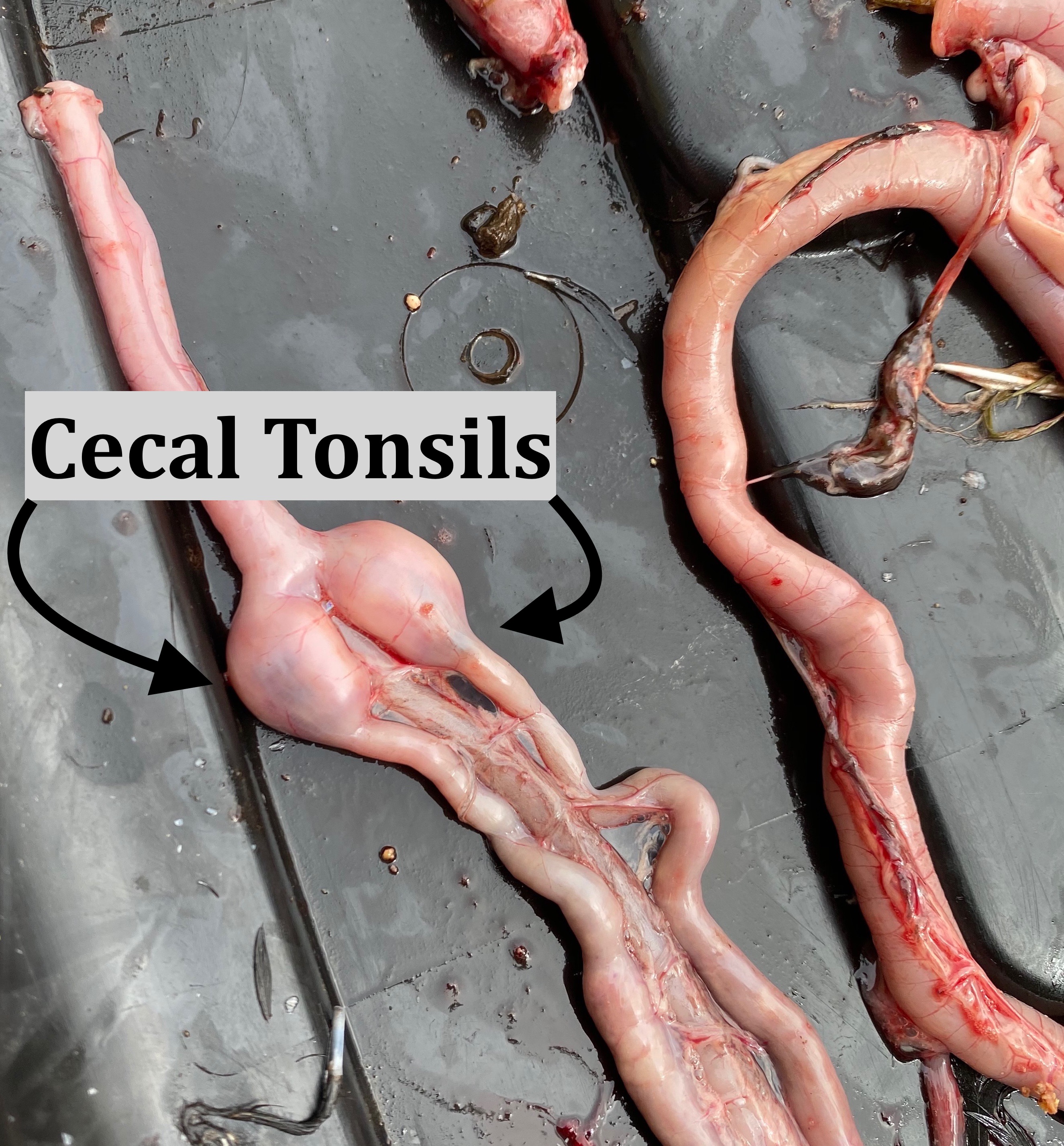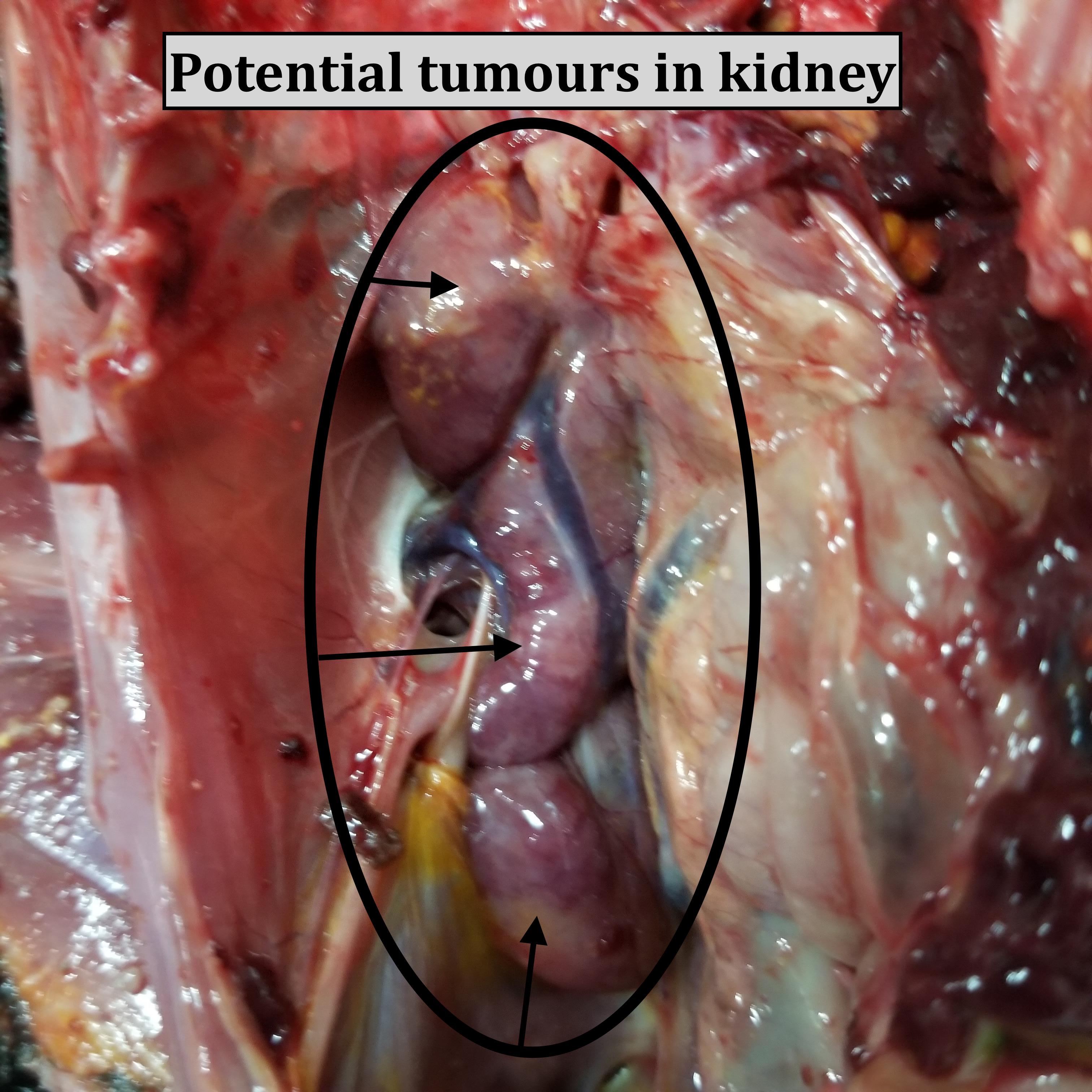 Dr Bowes: Her overall body condition was okay; the sciatic nerves, lungs, intestines and heart appeared normal; the gall bladder was full indicating she was not eating; the liver is light coloured; the kidneys were swollen, the ovary has classic signs of Marek’s. The cecal tonsils, which contain immune tissue, were ballooned, which could indicate possible Marek’s infection inside. Due to the involvement of the liver, kidney and ovary I would also suspect Marek’s Disease.