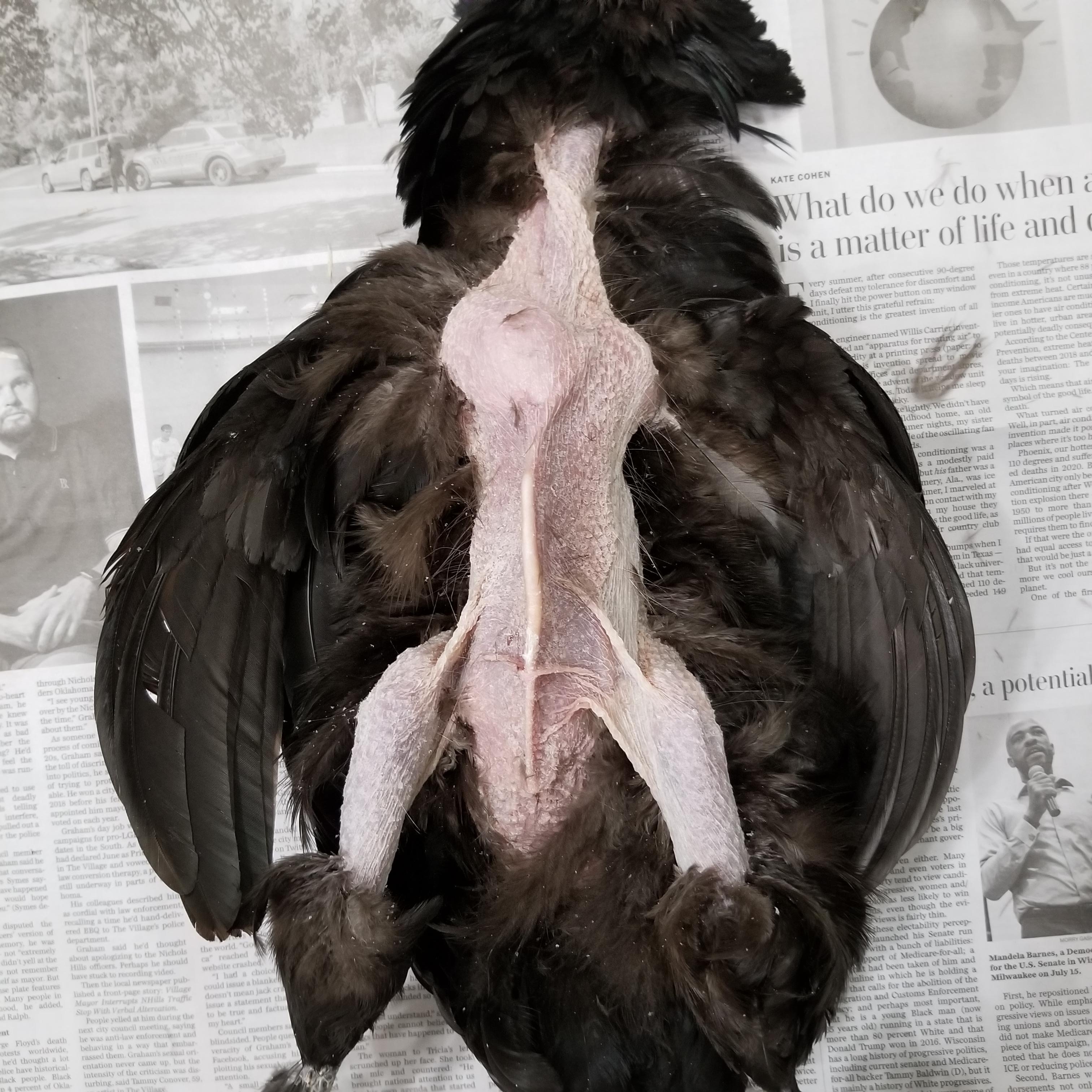 This is my Ayam Cemani x Brahma hen. Her wings became paralyzed; she dropped weight even while still eating, and then she just laid down and died. Only four days elapsed between my noticing her wing paralysis and death. Marek’s is what I’ve suspected and why I did a necropsy.