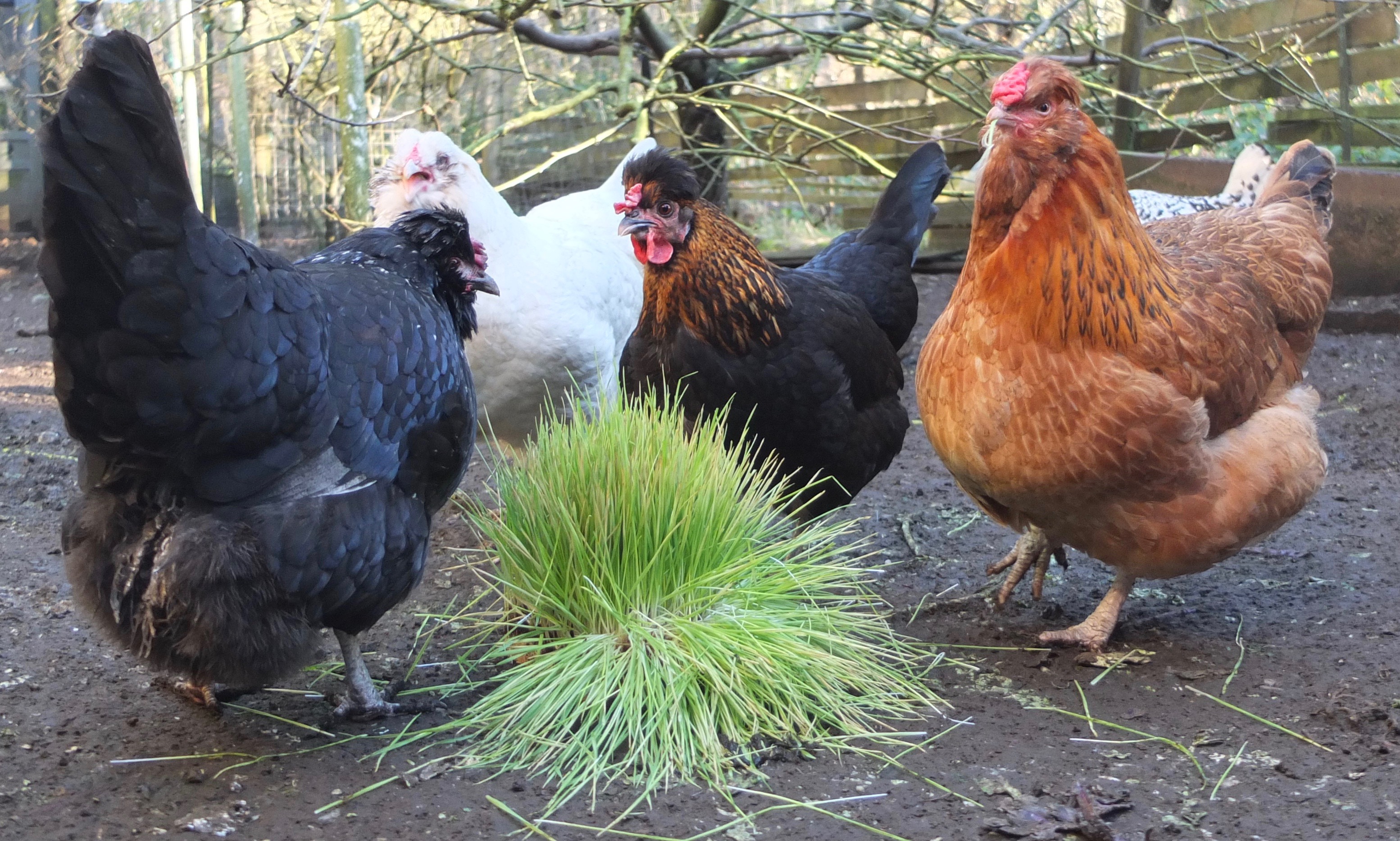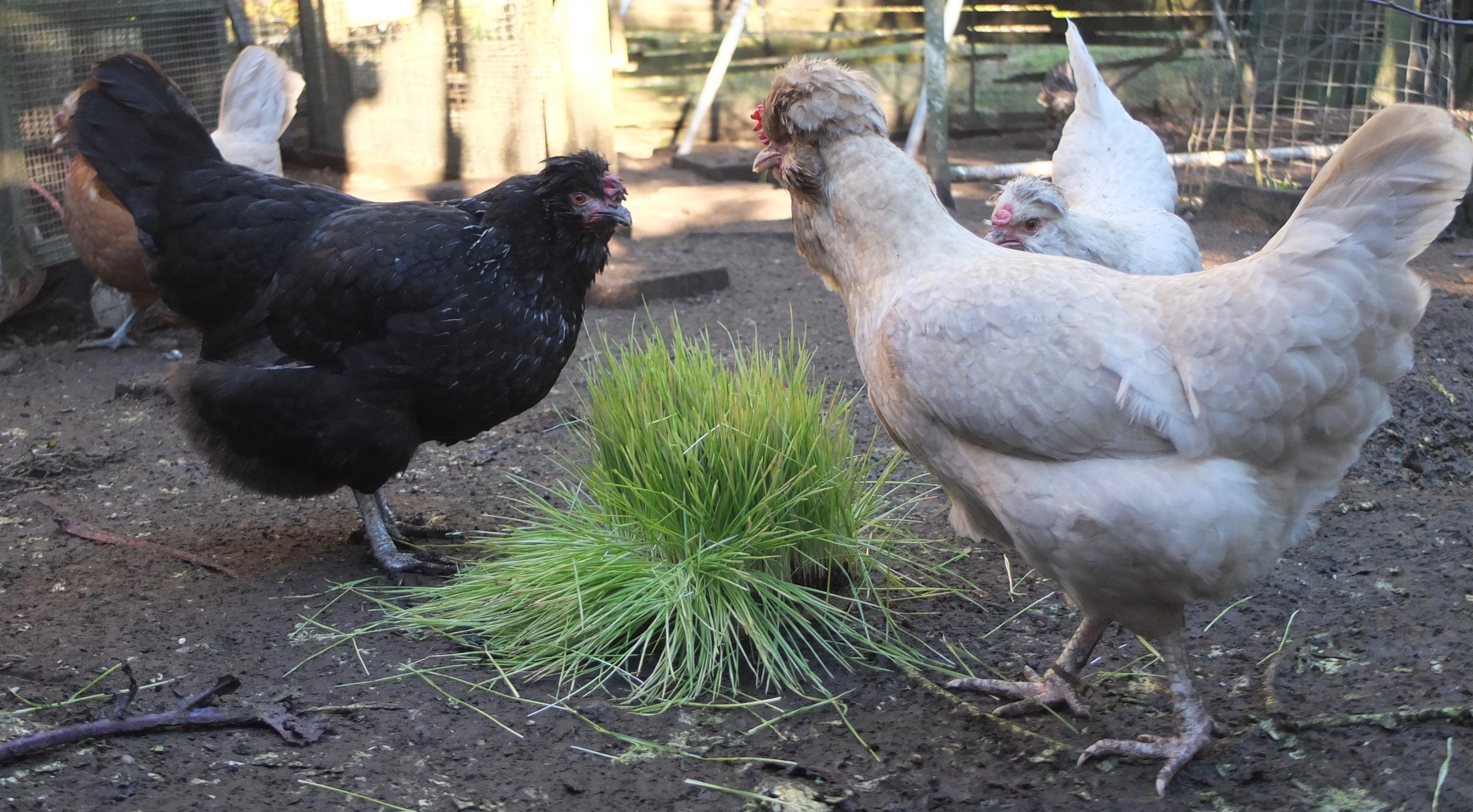Wheatgrass doesn’t require a green thumb and can be easily grown for a small flock, especially those that are penned and have scratched down whatever natural foliage might have been in their enclosure. There are loads of online sites recommending various ways to grow it: in soil vs soil-less products like coir or vermiculite; sprouting in mason jars, flats or bags, etc. It’s ready to harvest in 7- 10 days using scissors to cut just above the roots. The good news is the plant will regrow so you’ll have a continuing supply of fodder for your flock for several harvests before starting a new crop.