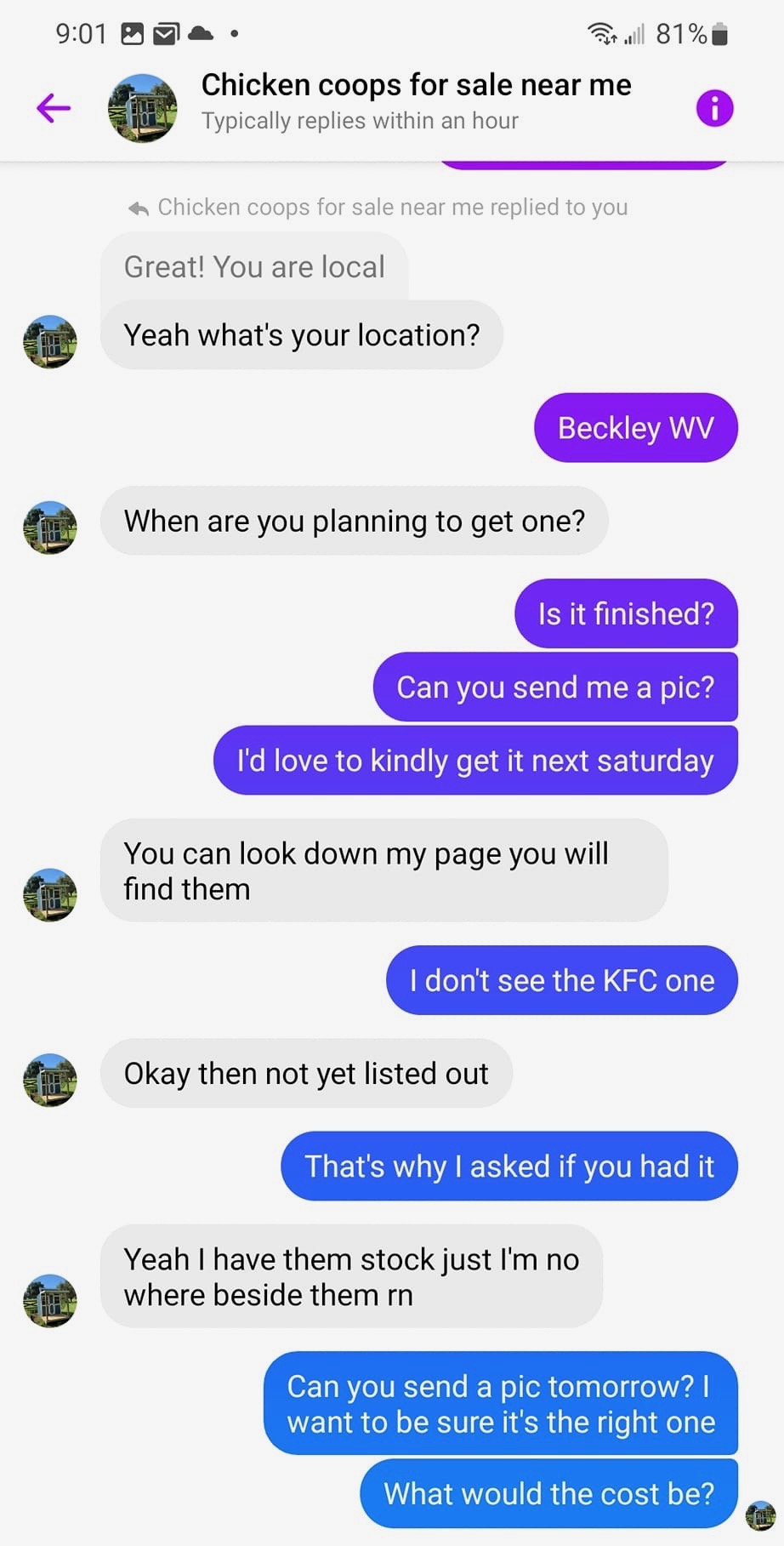 Posts written by cheeky chicken owners trying to catch scammers in the act: