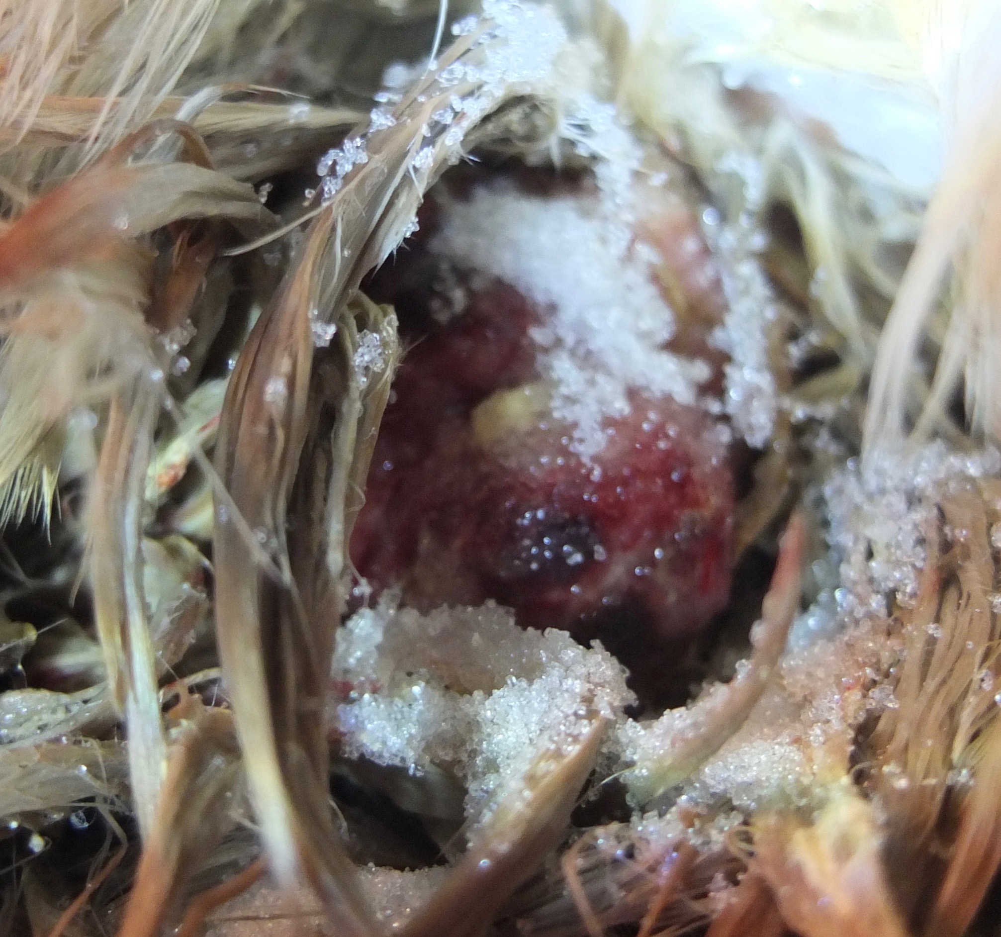 On to patient number two: Swaddling her in a towel, I covered her head in order to examine how much poop there was and if, by chance, I might be dealing with vent gleet. I was pretty surprised to see she had a prolapsed vent – a condition usually caused by straining to lay a soft-shelled or very large egg – which I didn’t think was there the day before. I’ve twice dealt with prolapsed vents, both times with new layers, and unfortunately there wasn’t a happy ending in either case.