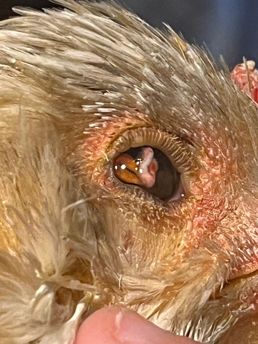 My hen seemed to have had a worm of some sort in her eye. Part of it was hanging out of her eye so I was able to pull it all out with tweezers. I doubt she will regain vision, but she is feeling much better now. – Kim Knapper