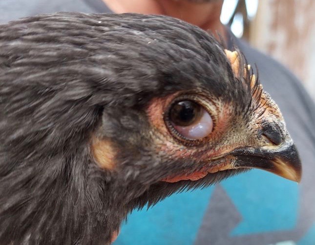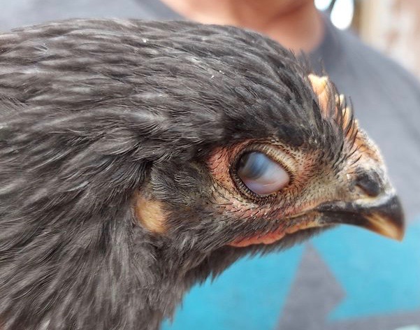 Dr Bowes: It’s difficult to tell from the photo if the actual eyes are shrunken or not. Is that a reflection or inclusion in the pupil? The eyelid is not protecting the eye, which can become a long-term problem if it doesn’t stay clean. The iris does look irregular. Keep the eye protected by used protective eye drops like Terramycin. I can’t diagnose from just the photos but these issues can be caused by Marek’s Disease and Salmonella.