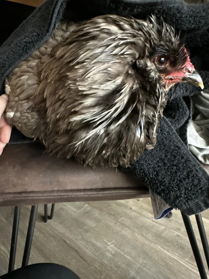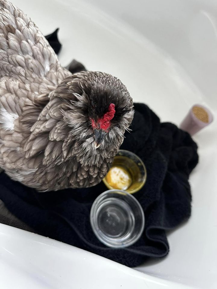 I unrolled a half dead, soaking wet chicken. I thought she was dead, but then she blinked so I scooped her up and ran inside. Towel swaddled and syringed some egg yolk. She can’t walk right now really because she’s too weak but she is eating and drinking on her own and currently bunking in my bathtub with lots of vitamins and supplements.