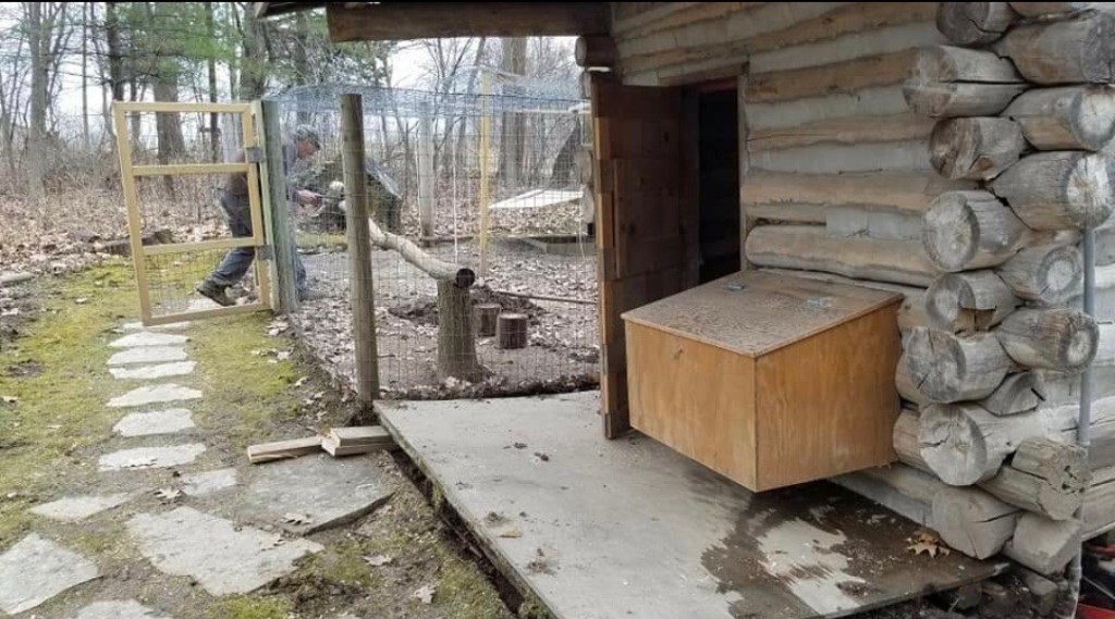 A metal roof was installed over the run and old log cabin both unifying its appearance and providing shade and shelter from the elements year round. It’s totaled wired making it predator proof.