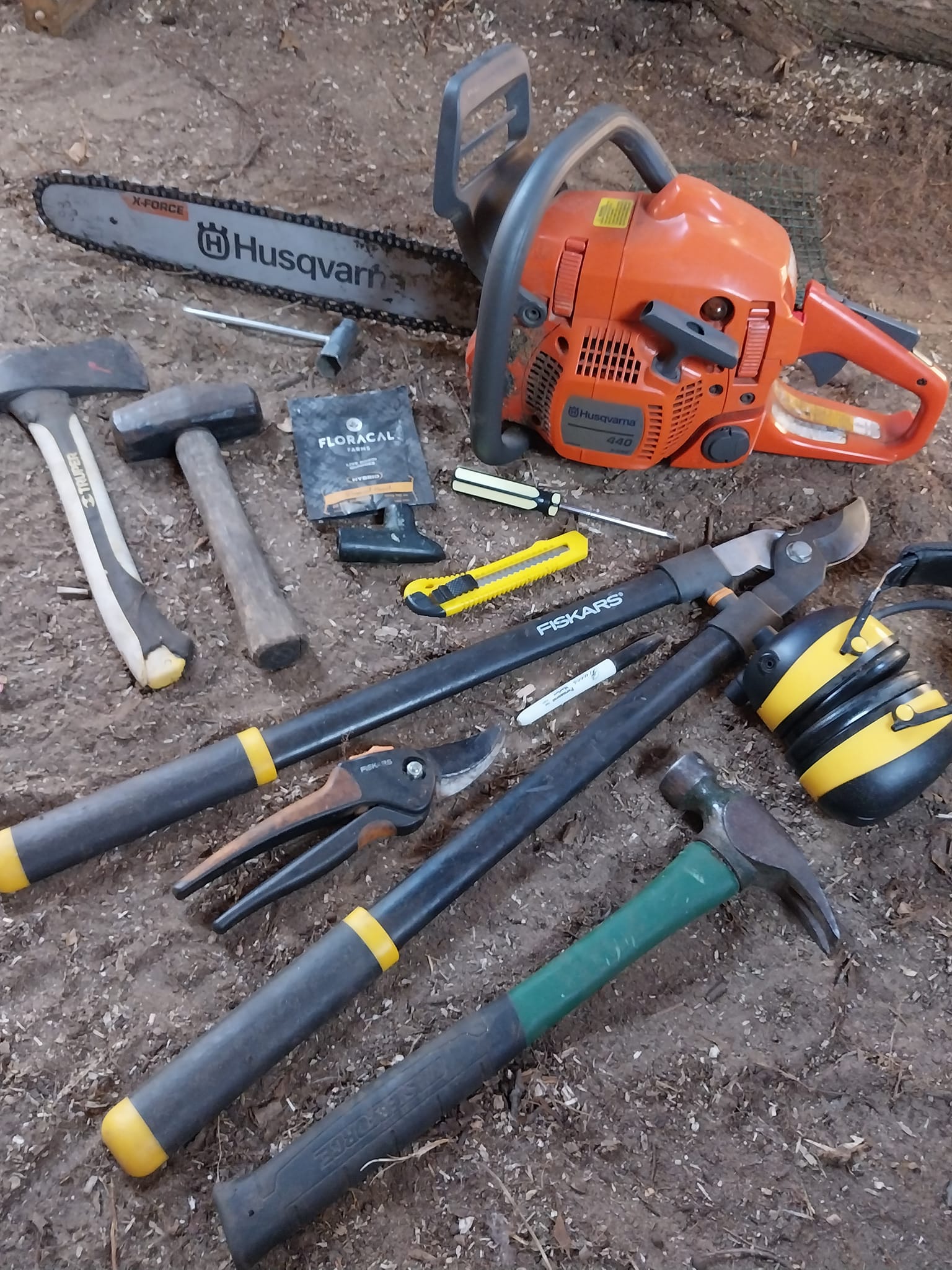 I use all the wrong tools in the right way, but these were the tools I used to create it (plus a shovel and stapler). This is as pure as it gets for me: no electricity, just aggression with a hatchet, hammer and a little finesse with a chainsaw, two gallons of gas and one gallon of bar and chain oil. I spent about $700 on nails, hinges, locks and a pond liner and $340 on hardware cloth.