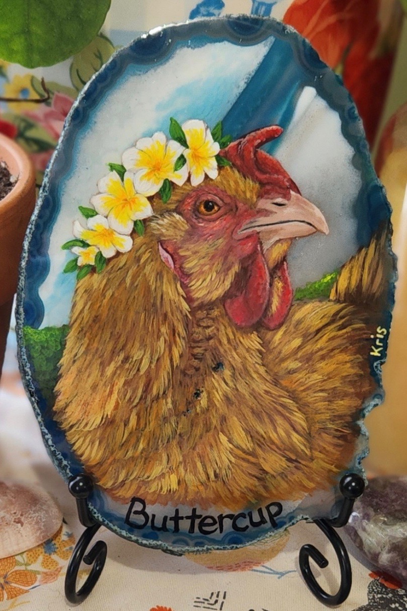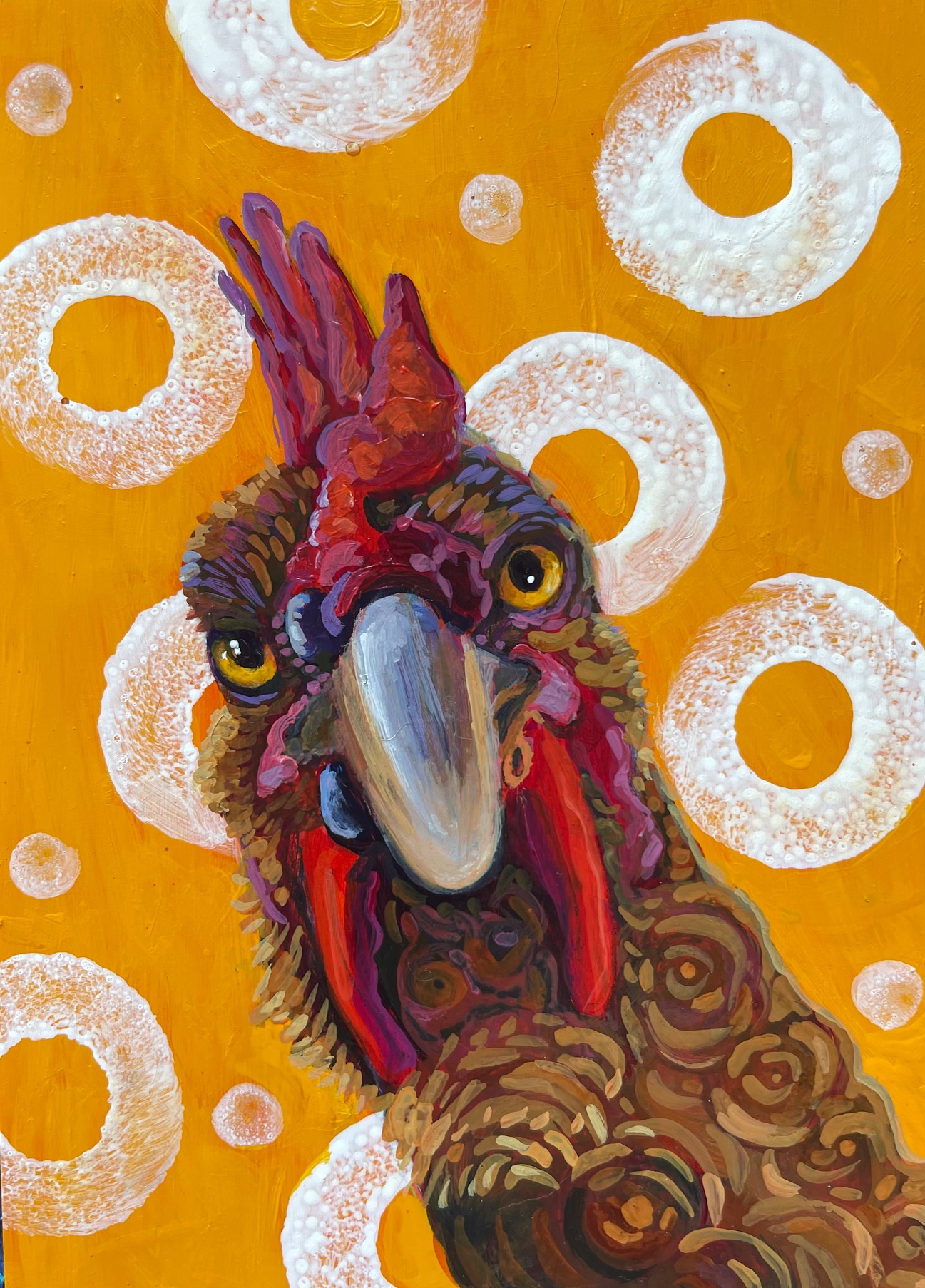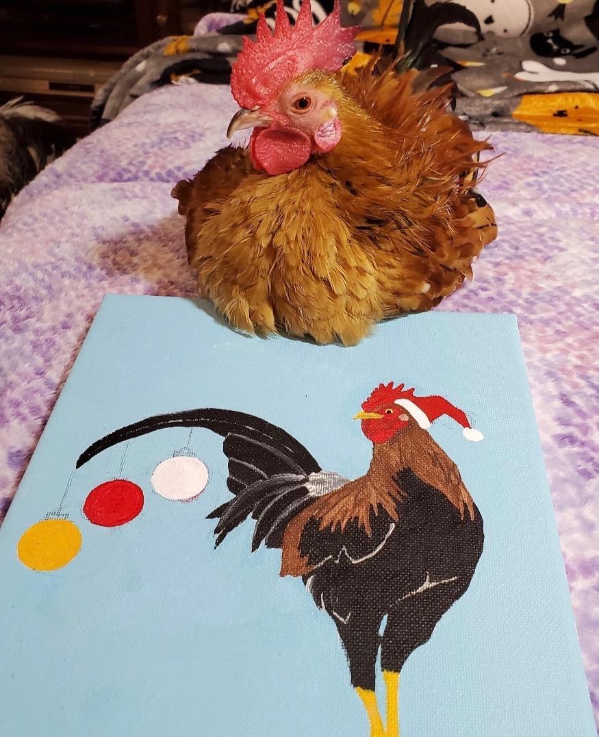 In 2019, I went to pick up a new pet pigeon and the lady put a red chicken in my arms and said, “This is my sweetest hen”. I immediately fell in love. Needless to say, Bonnie, the hen came home to live with me in my apartment. It was around that time I shared my art with an online chicken group and started painting chickens for people.