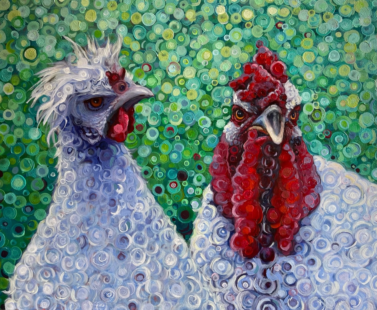The one thing I really love about chickens is their personality, they are all so unique. People laugh when they see my chickens, they love the humour in them. I don’t feel like I have to add or exaggerate to capture this. There is some comic relief in chickens. I love to paint subjects that are uplifting, and chickens bring joy. I don’t see an end to chickens being one of my favorite subjects.
