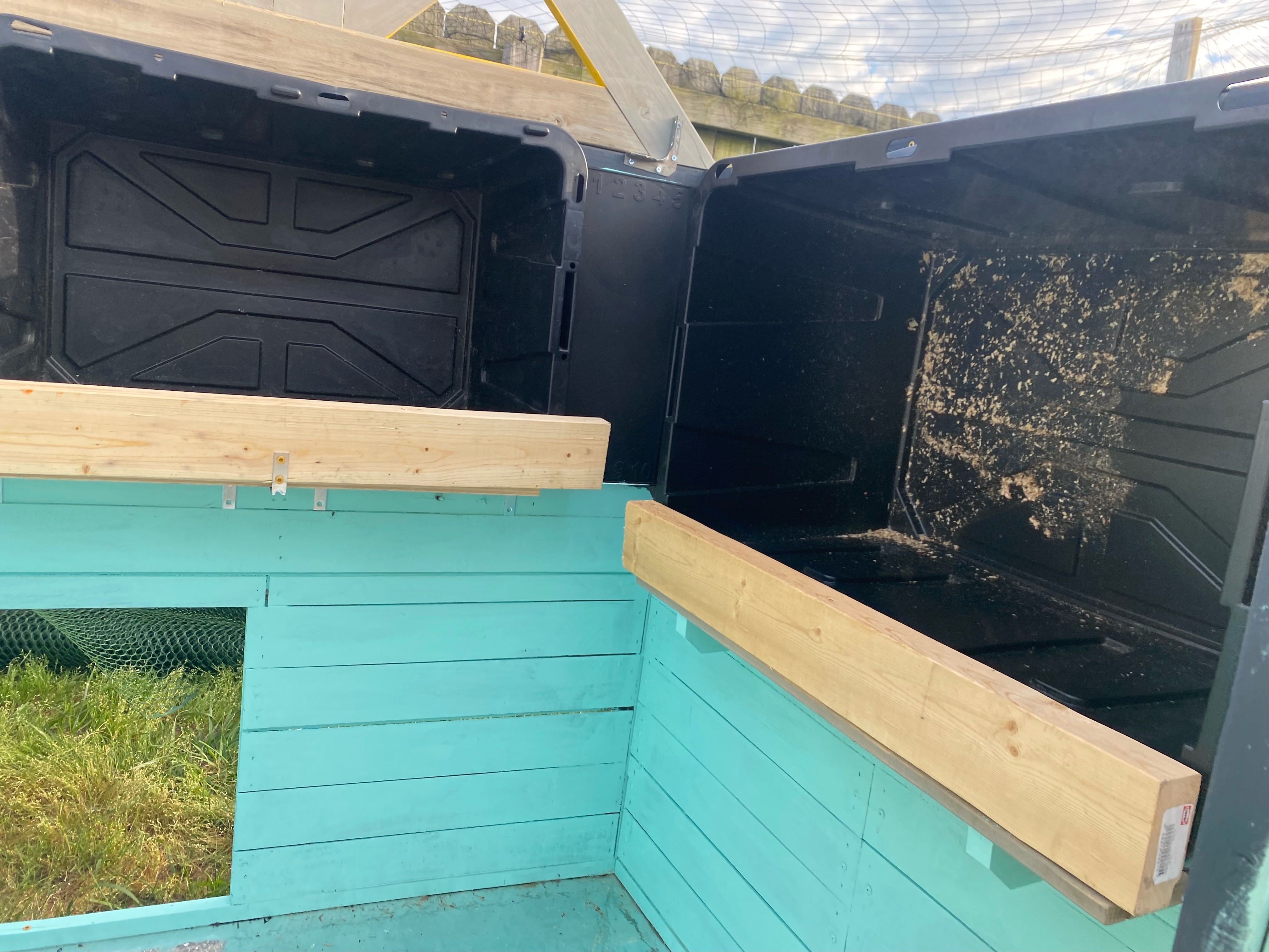 - A nest box with two compartments made from plastic totes was installed on either side of the coop
