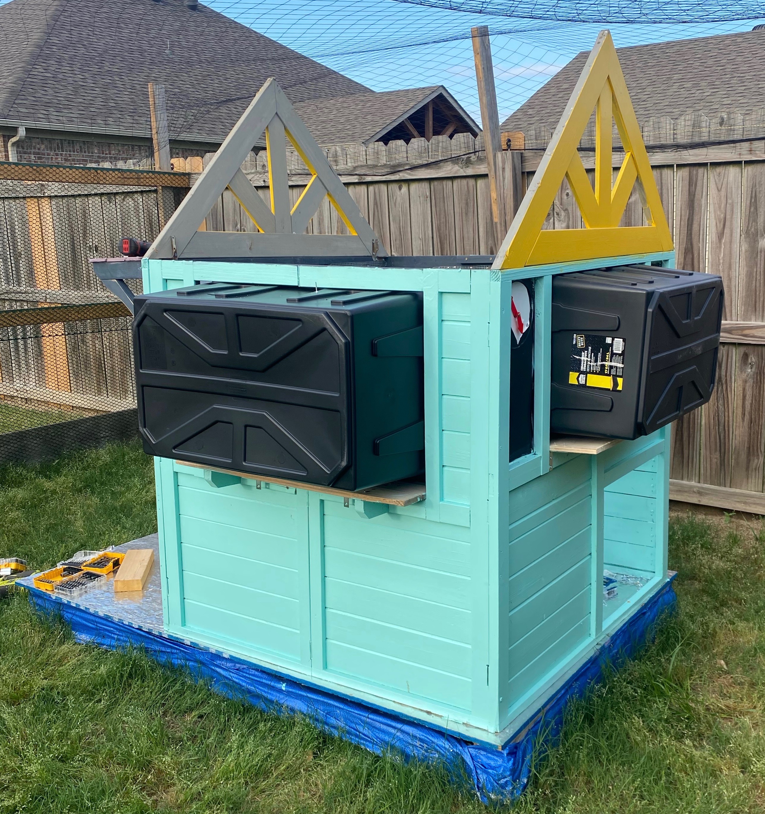 We paid $195 for the playhouse, which we found on Facebook Marketplace. I searched for a wooden one because the plastic playhouses would be hot and hard to screw things into. Wood was the way to go. It was a little more expensive but worth it.