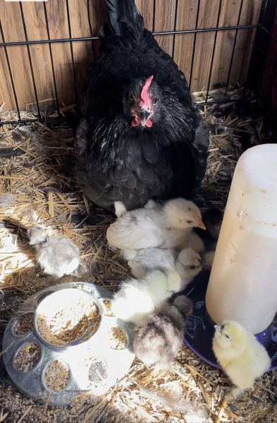 My broody Australorp hen allowed me to be her midwife throughout her chickency when she hatched out one chick. This week my friend gave me a bunch of newly hatched Silkie and Showgirl chicks. I was going to put them in the brooder when I thought to offer them to her. I raced into the trailer where her chickominium is. As I got to her cage she heard the babies and was instantly interested. I opened the door and put two inside near her, but not too close. She stretched out her neck, looking all around as if to say, “Hey, someone lost their kids”. Twenty seconds later, the two babies walked toward her, she stretched her wing and under they went. I was so over-the-moon excited that I immediately put the others in too. This time her eyes got wide and she looked directly at me. She either said, “You have got to be kidding” or “For me?! More presents”.  Another twenty seconds and they disappeared under her. I am so proud of her. Honestly, I have never seen such love and tenderness.