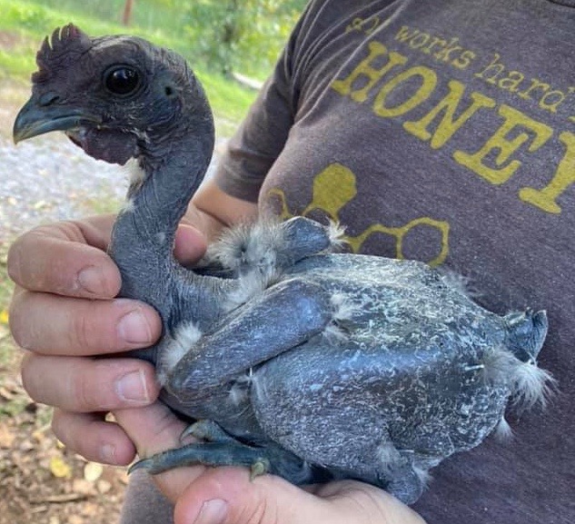 This is a chick hatched by a broody hen. It’s connected to its partially formed parasitic twin via the umbilical cord, which is the latter’s source of nutrients and blood supply. Once hatched, the umbilical cord dried and the parasitic twin died and was easily removed by clipping the remnants of the cord that attached the twins together. (photo credit: Lacey Newby)