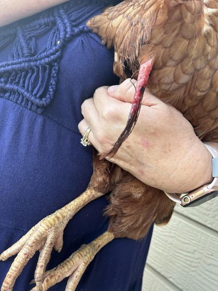 She had been out all day and came back to the coop looking like this. It was soft like an intestine. She was eating, drinking, and didn’t seem to be in pain. The next day it had turned black and necrotic. She ate breakfast, drank water and was out free ranging with the other chickens acting like nothing was wrong. Later that day another one emerged and also turned black. It truly looks like a pulled feather. What is it and what can I do? – Tammy Anne