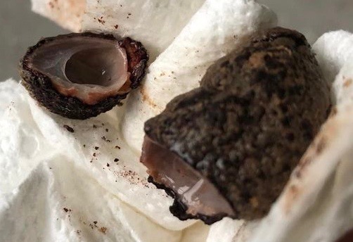 Dr Bowes: The egg is very dark which makes me think the hen normally lays a pigmented egg. It was probably stuck in the oviduct and accumulated that texture. I’m curious as to the contents and if they were normal or not.