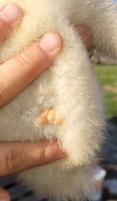 This has been on my gosling since it was born. I thought it was to do with the yolk sac but it never went away. They are soft and growing, as the bird gets bigger. – Sarah Frayer