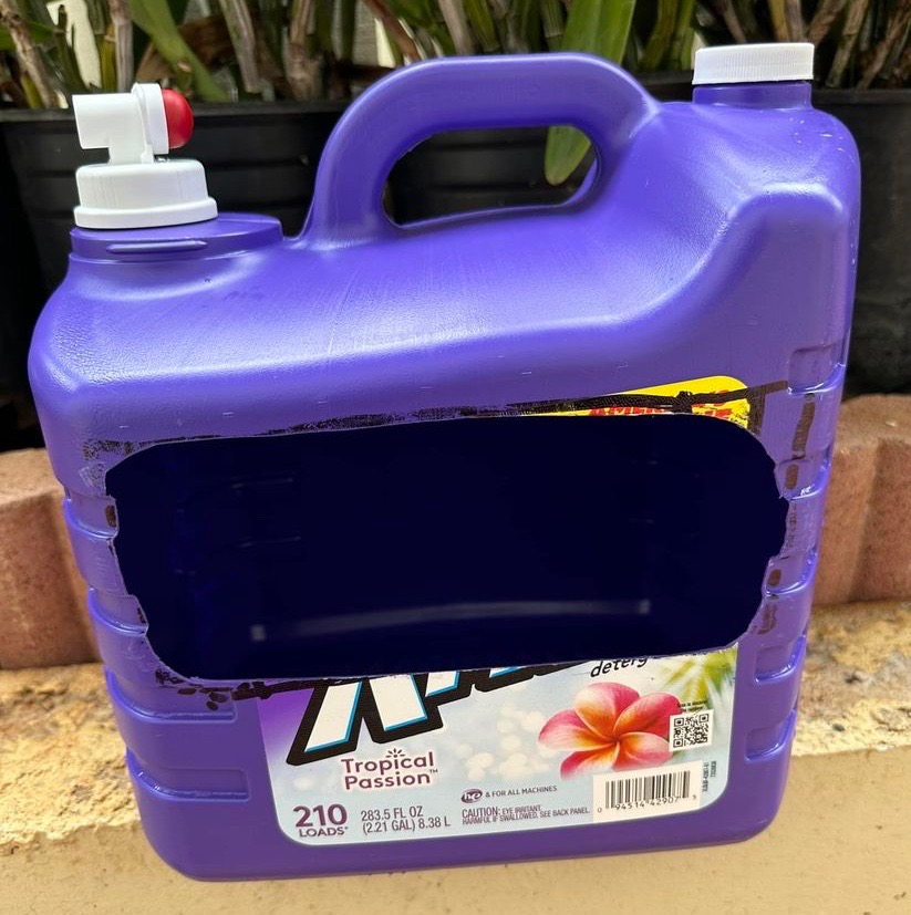 A while ago, I watched Cor place the empty laundry soap container on the edge of the concrete planter box near my home. It seemed he was planning to secure it inside my coop with a wire. He had even cut a rectangular hole in the side of the plastic container, creating a window-like opening that I could pass my head into to access my food. I wasn’t sure if he would install that new feeder right now, but I eagerly await the chance to try it.