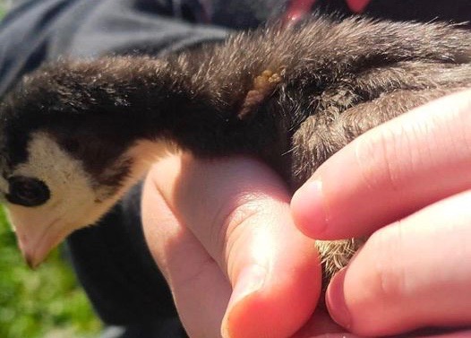 This 2-week-old turkey poult has bits of attached flaky skin. It’s not flystrike. – Bfg Farm