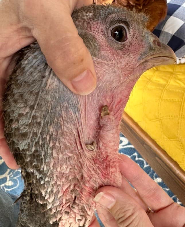 I need help on identifying what these are on one of my turkey’s neck. They are hard to the touch and protruding under the skin. I pulled them out with tweezers from the top; pushing from the bottom, then rinsed it out and the liquid exited the other wound; they are connected. I squeezed antibiotic into both holes. It’s softer the deeper it is, so I couldn’t pull it all out. – Kimberly Armstrong