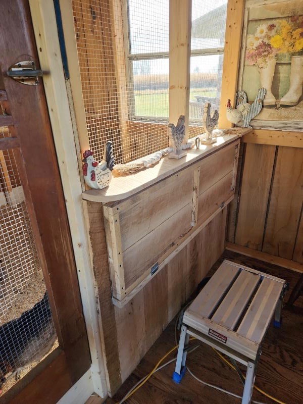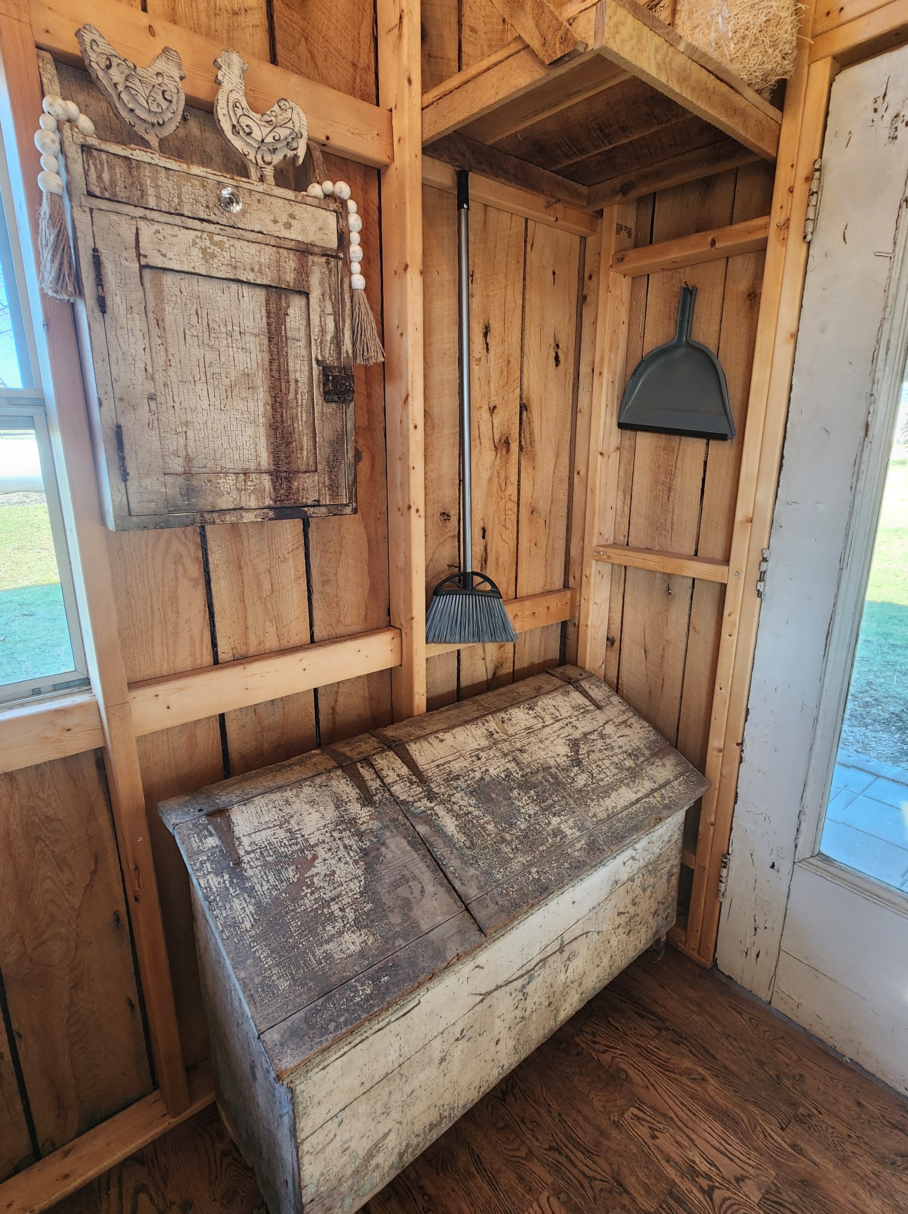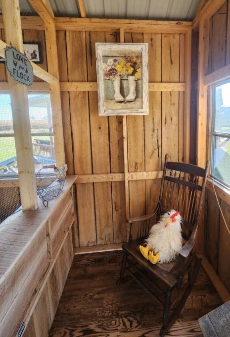 We budgeted different amounts. We wanted nice but went for thrifty. My hubby went to the local Amish community to order our oak boards and battens. His love for wood shows on all of his projects. We had some leftover hardwood from our son’s remodel so I grabbed that for my side of the coop. We sanded, stained and polyurethaned that to our liking. My dad donated an old grain bin I am so grateful for. He used it for years so, again, my sentimental side is showing.