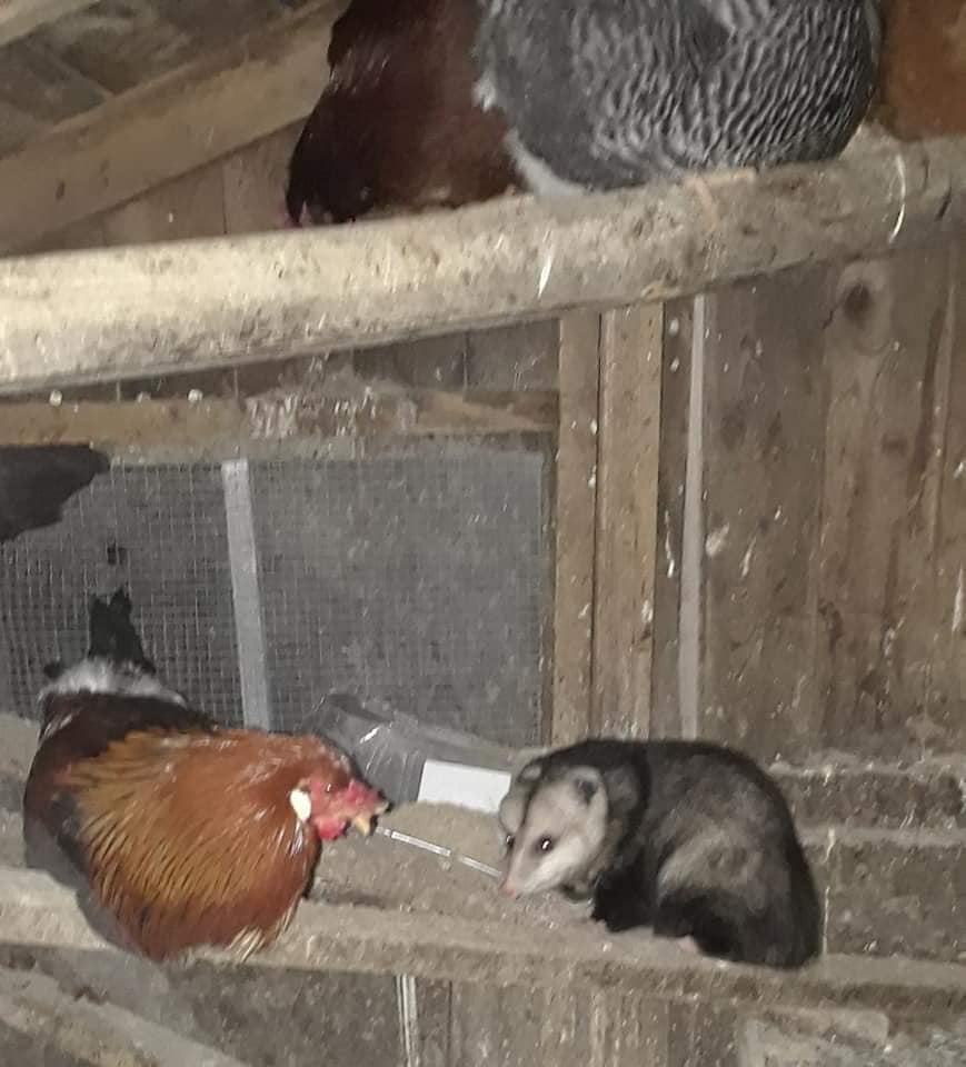 An opossum. I’m like, “What the heck”?! But I’m more impressed that my hen came to the door to tell us something was wrong out there.